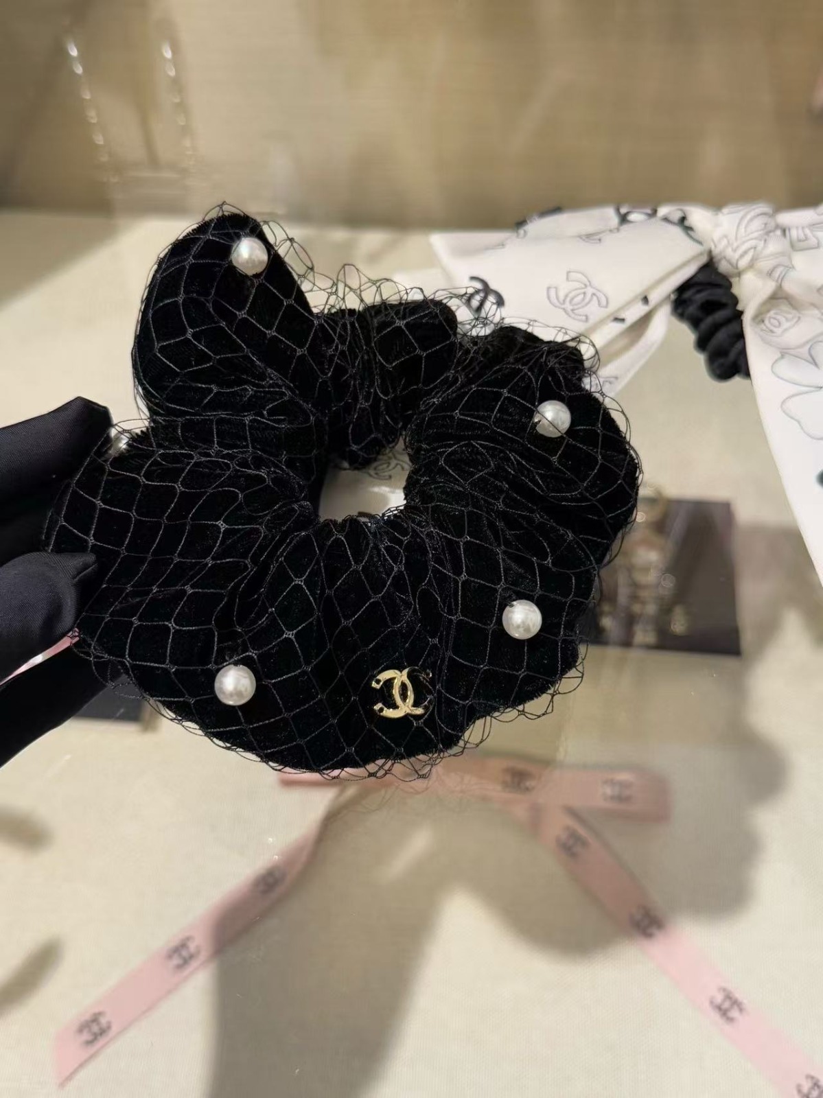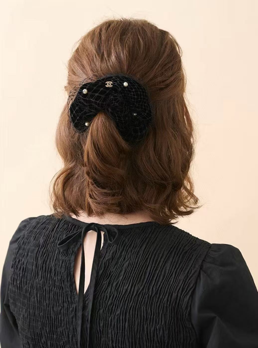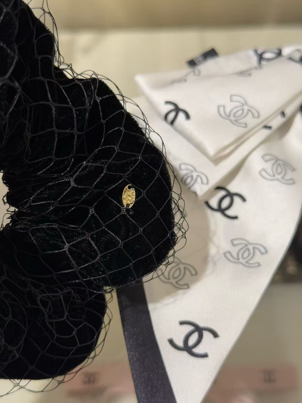 🧵黑絲絨與網紗結合,觸感柔軟🕸️細膩,輕盈耐用;小珍珠✨點綴增添光澤,淺金色CC徽標精緻閃耀🕸️