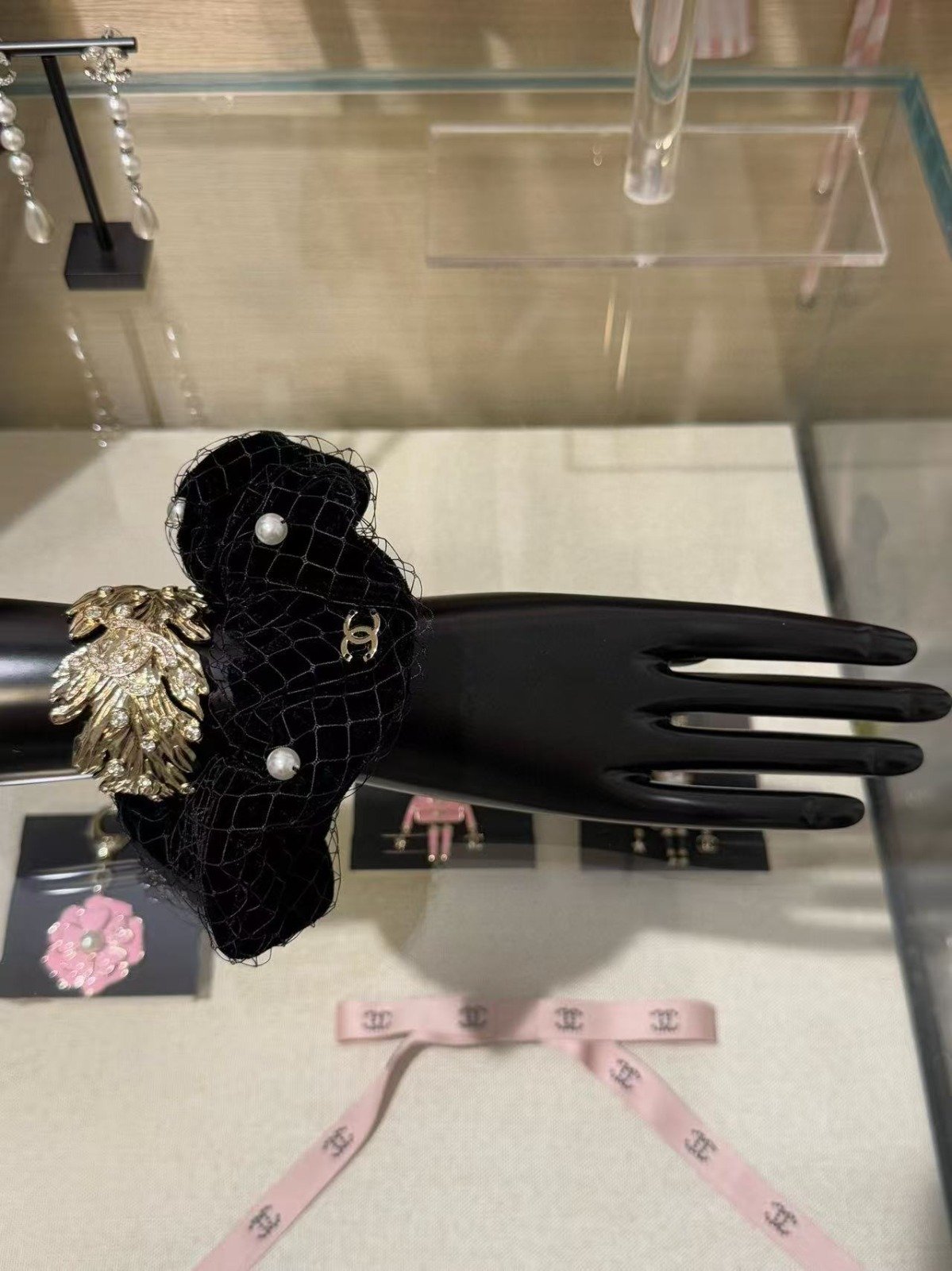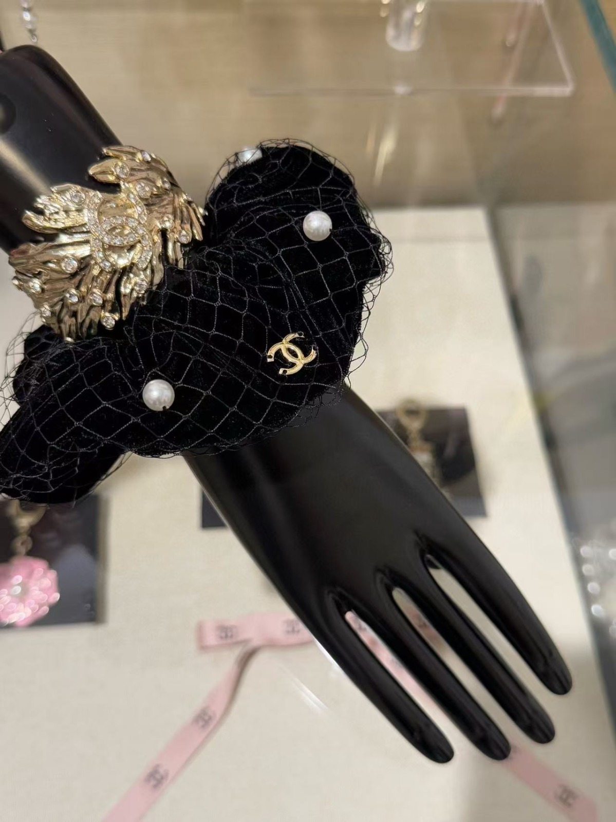 以經典CC徽標🏷️為核心,淺金色🟡調低調奢華,黑絲絨與網紗包裹增添復古層次,小珍珠點綴🕸️