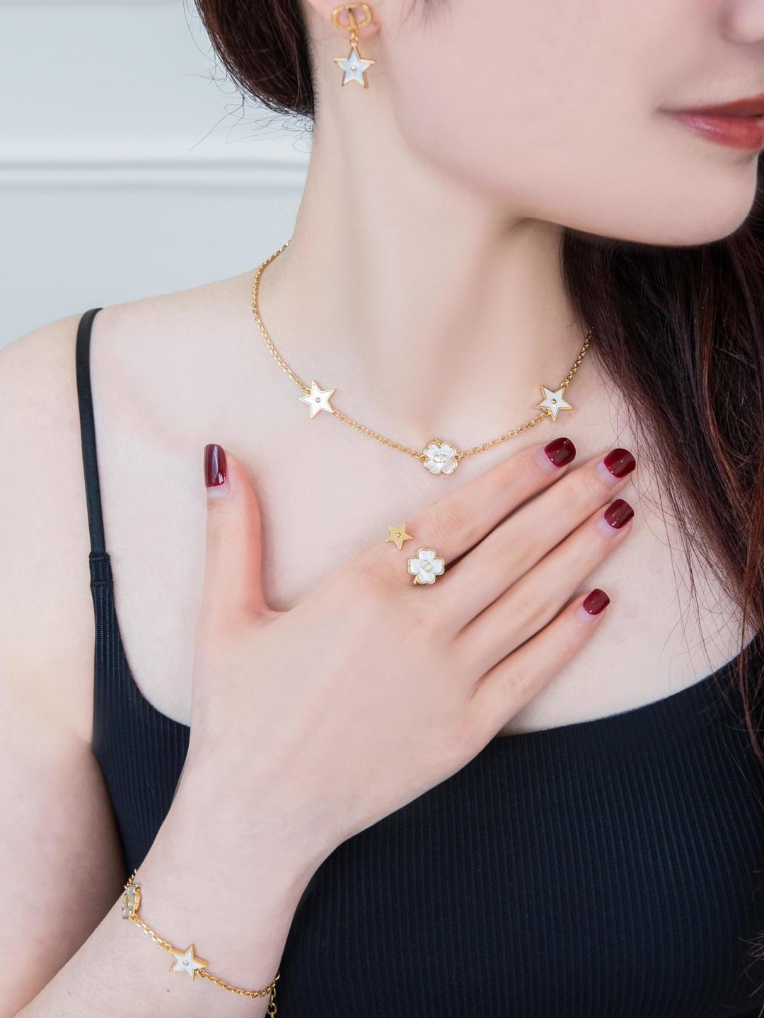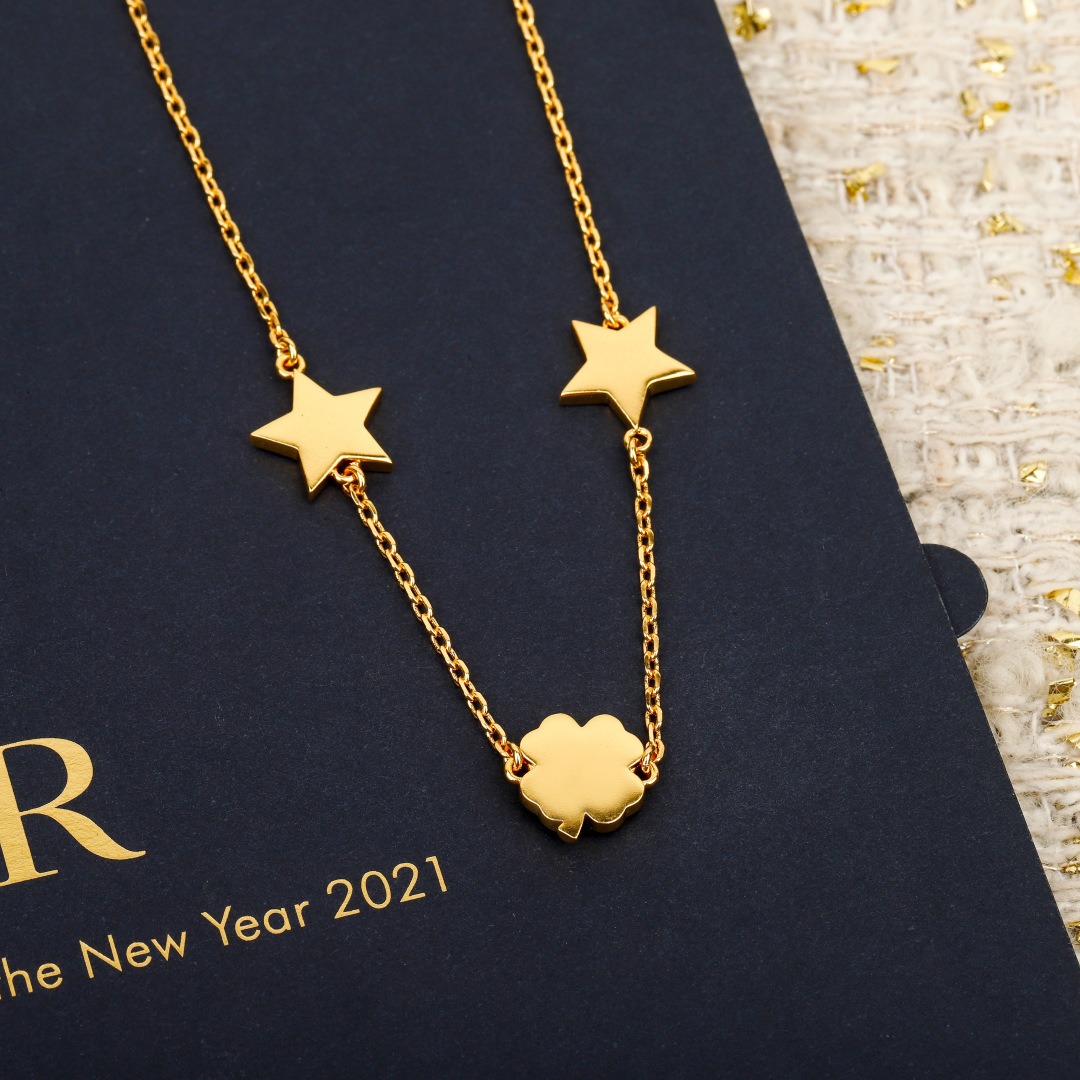 這條項鍊結合了品牌經典的 🏷️CD logo 與幸運四葉草☘️設計,星星⭐與四葉草皆採用天然🐚貝殼打造,每一顆都有獨一無二的紋理與光澤✨