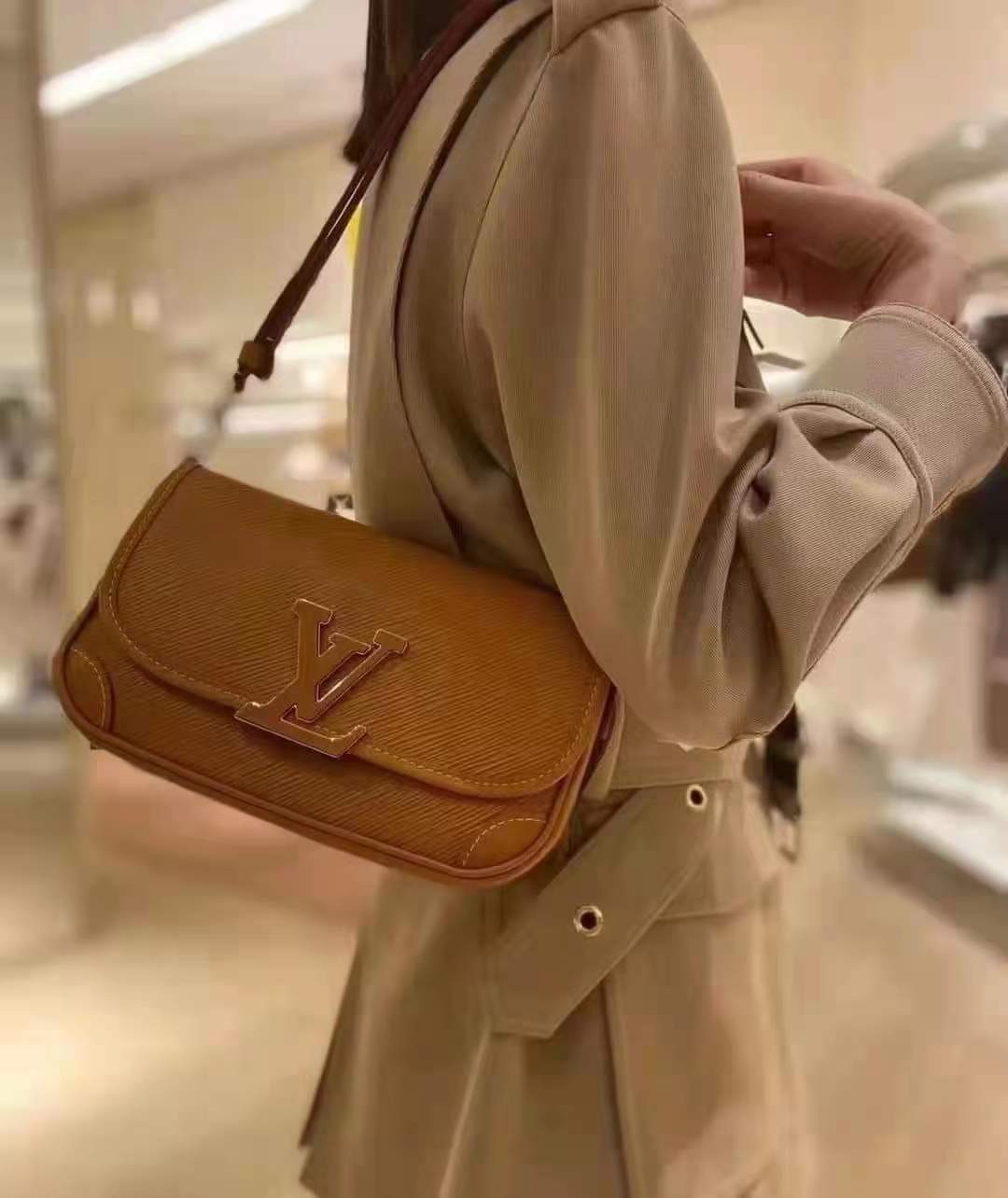 設計綴有滑面皮革包角、飾邊和風琴式摺邊,彰顯經典袋款的柔和線條,加上同色調LV樹脂裝飾,增添現代時尚氣息。