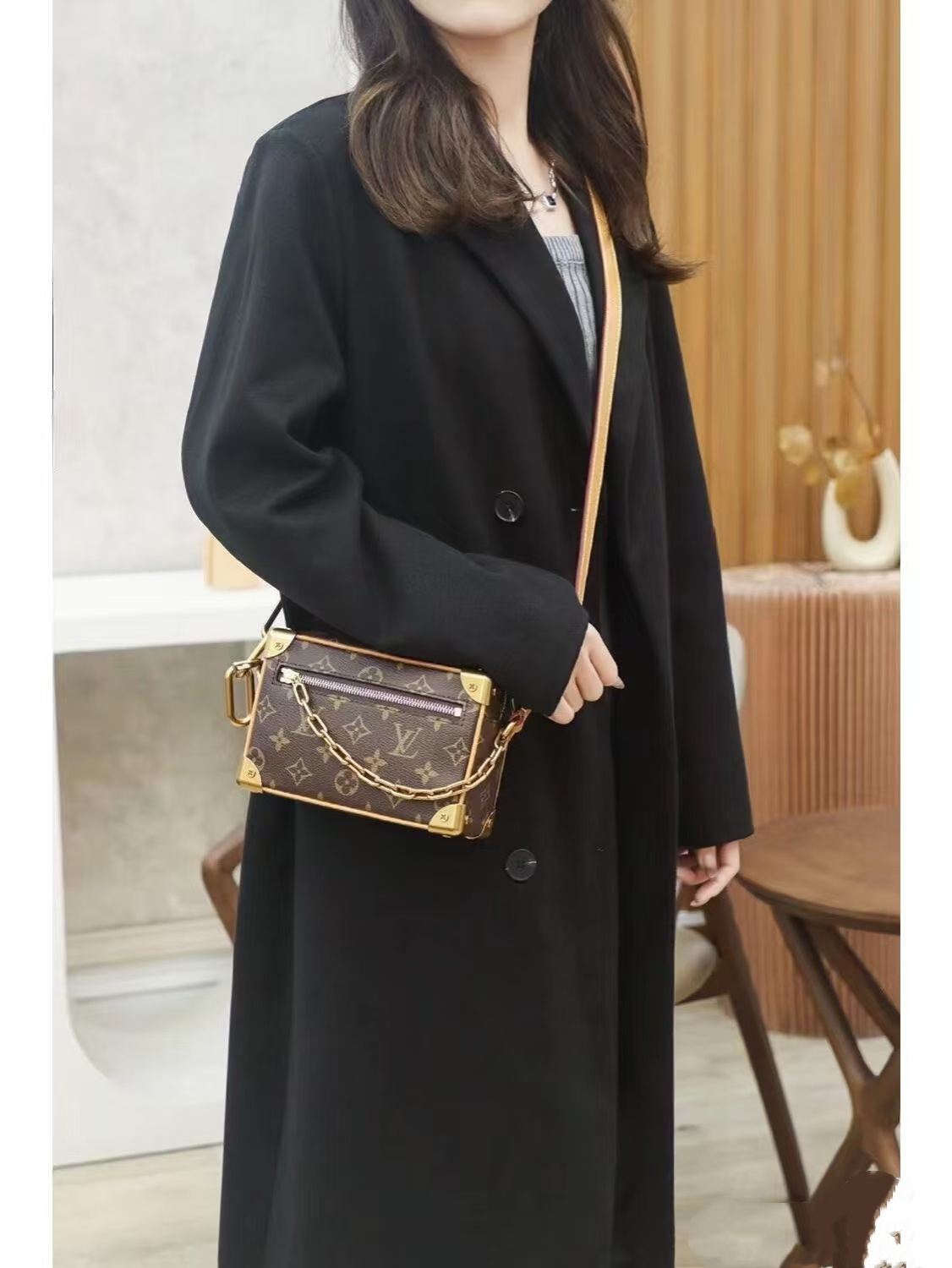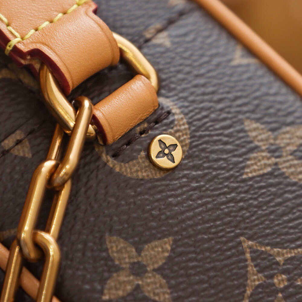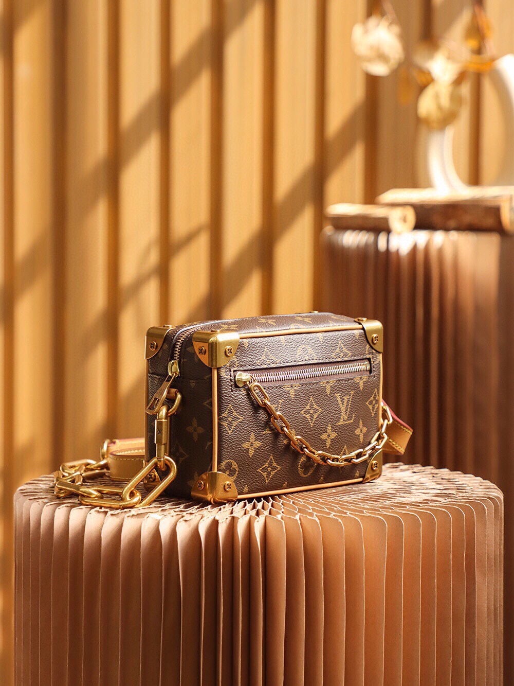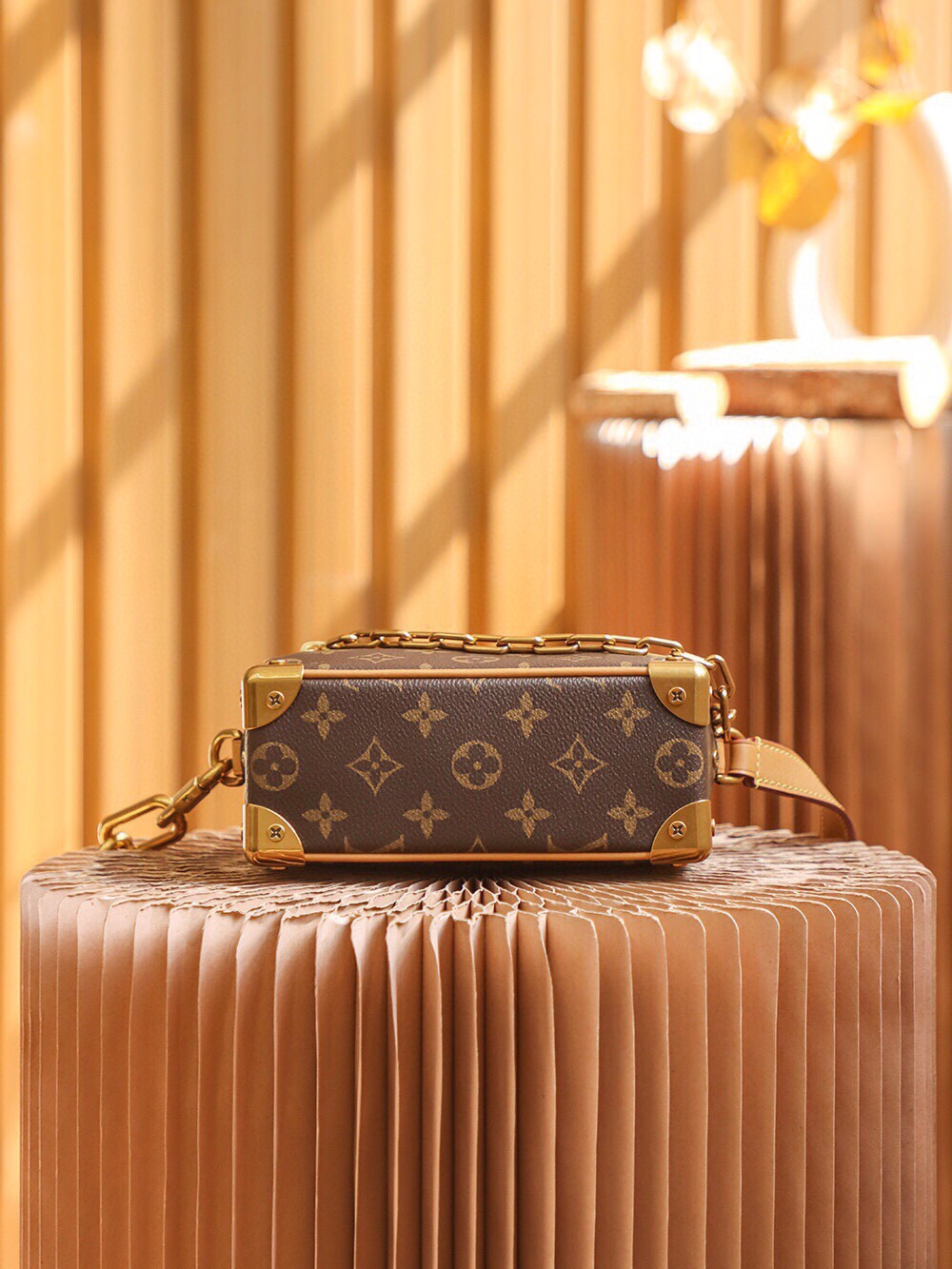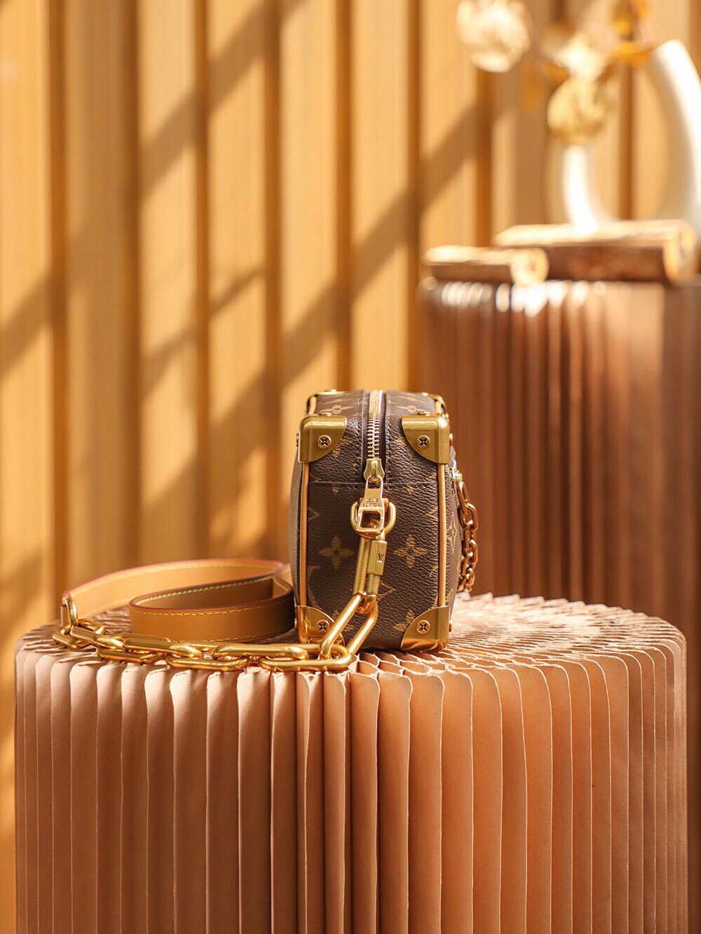 這款Mini Soft Trunk手袋以加固包角的箱形設計直接傳承路易威登的原創行李箱。設計配有兩條鏈帶,一條連接外袋拉鏈,另一條則作為肩帶的一部分,小巧別緻的款式別具現代時尚氣息。