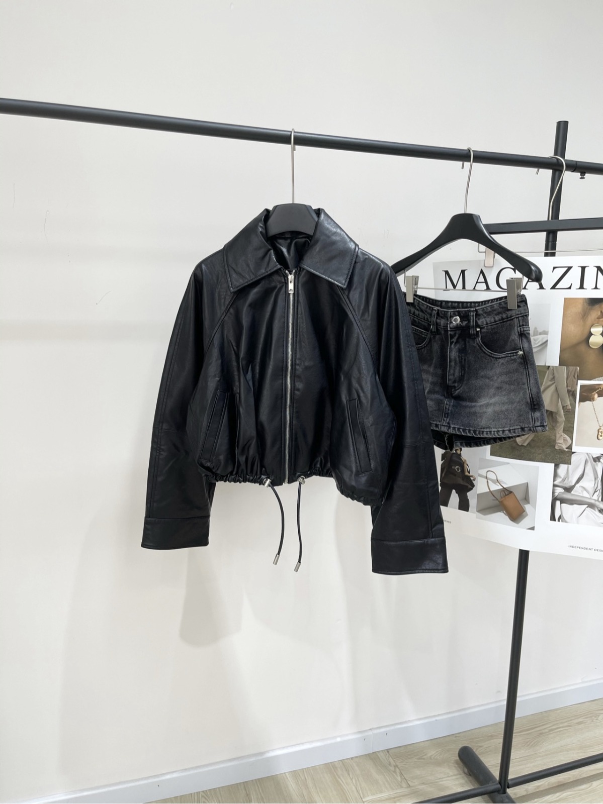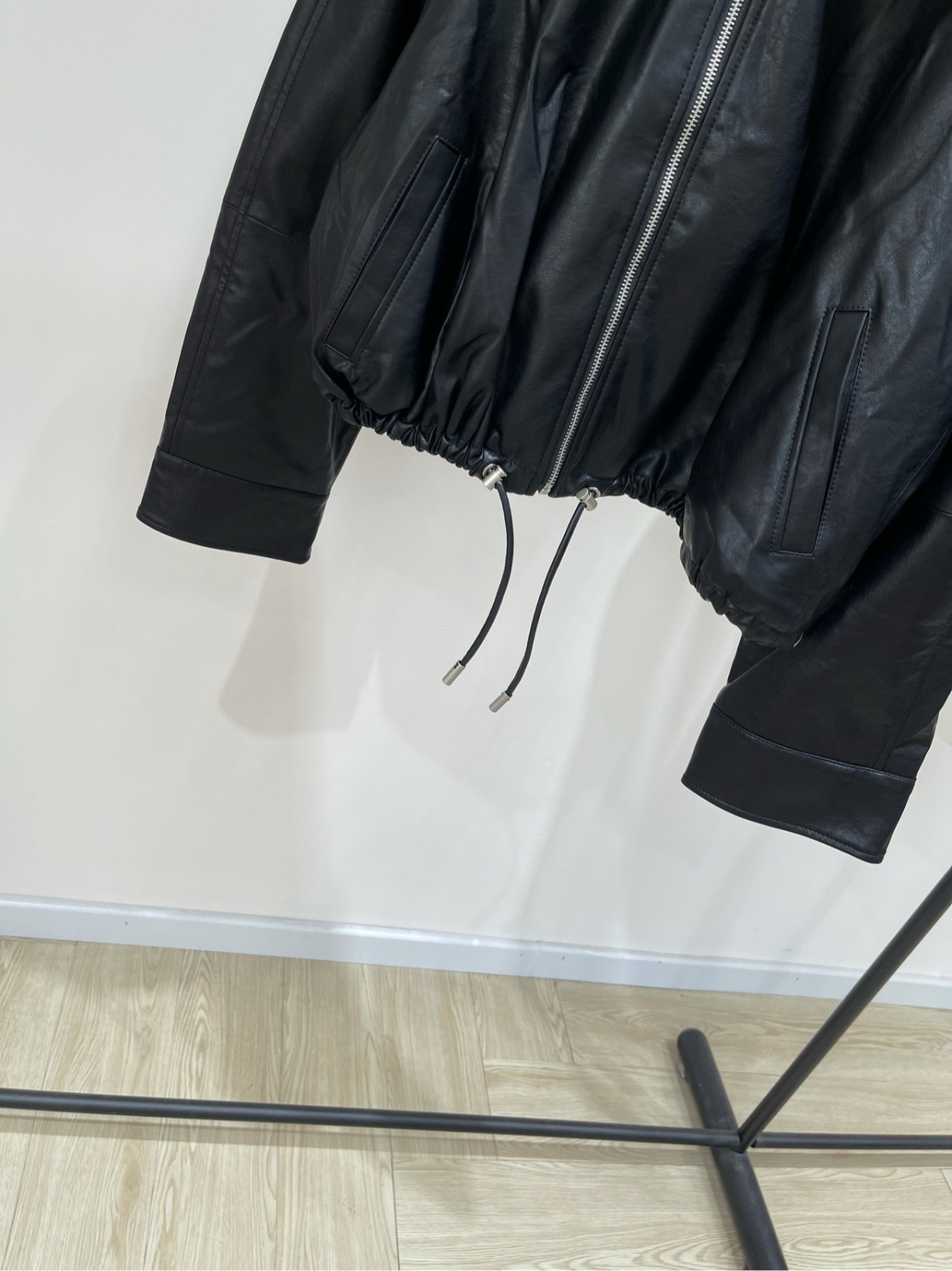 採用柔軟輕盈的皮革製成的外套,輪廓寬鬆,下擺配有可調節的皮革抽繩