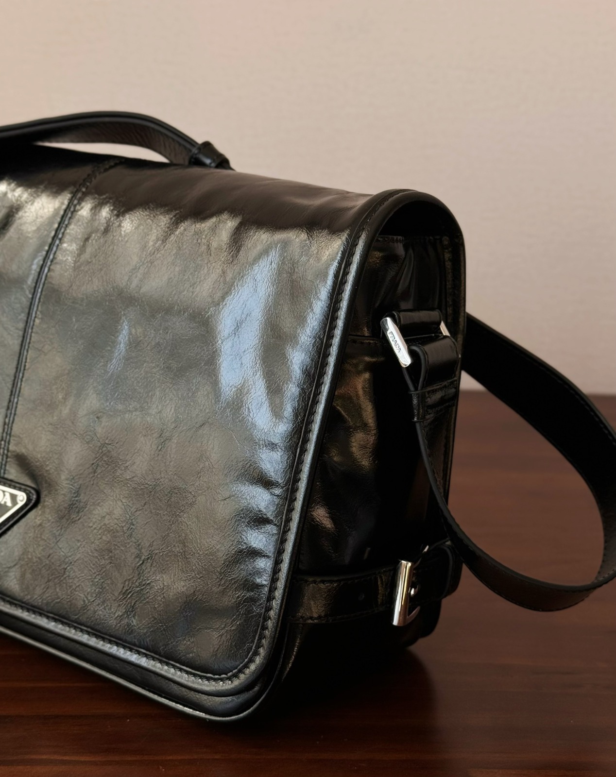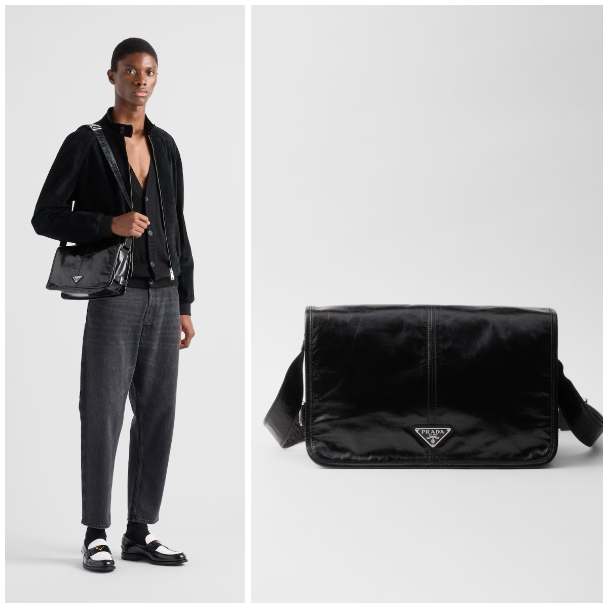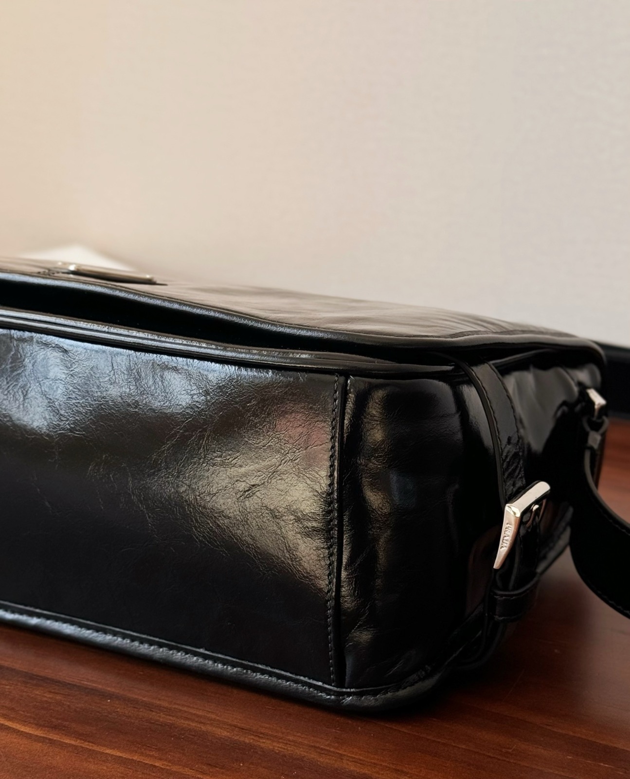 這款肩背袋時尚百搭,採用柔軟皮革製成,線條簡潔流暢,擁有光澤飾面,綴以獨特的三角標誌。
