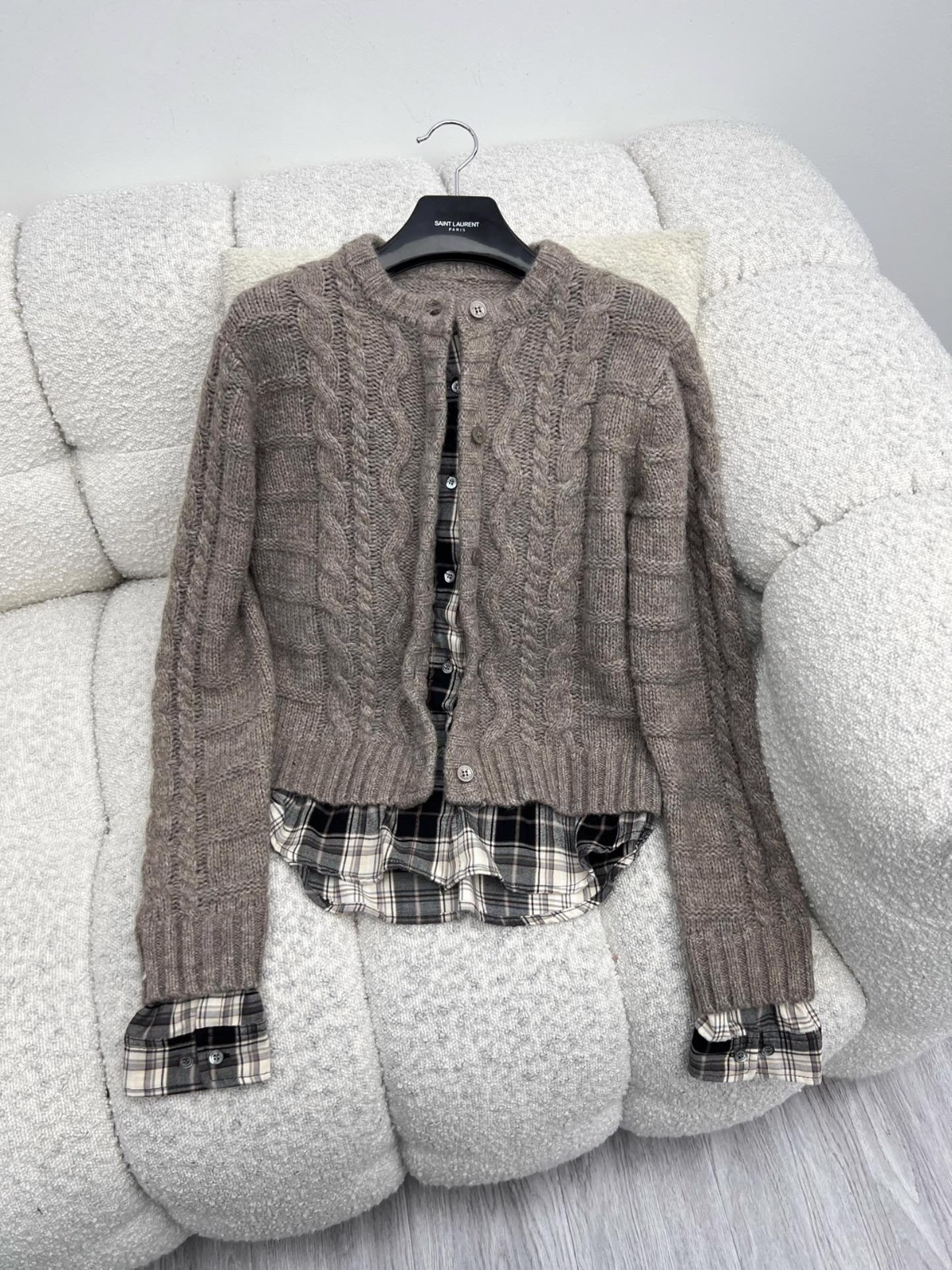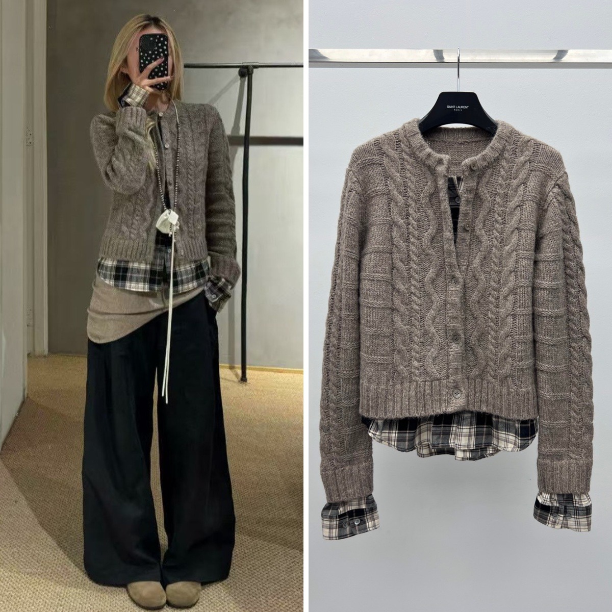 🔲格紋襯衫拼接在領口與袖口處👔細節自然又有存在感,讓整體造型在慵懶與😎俐落間取得完美平衡✨