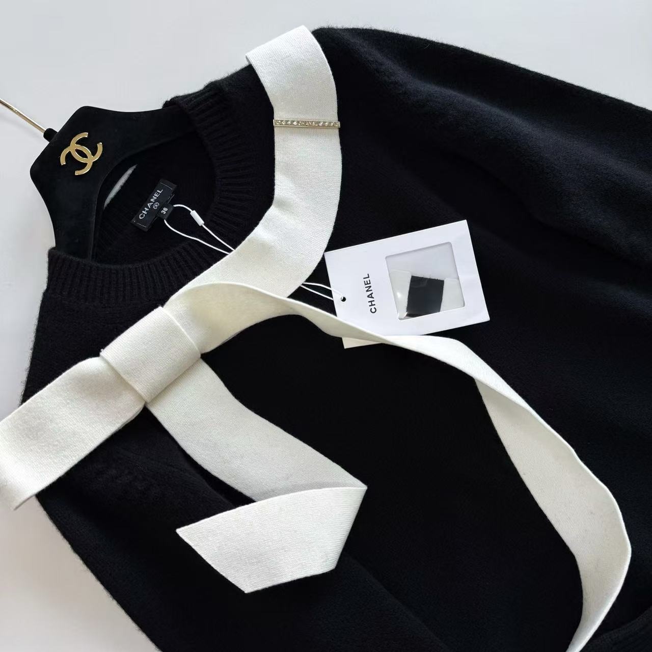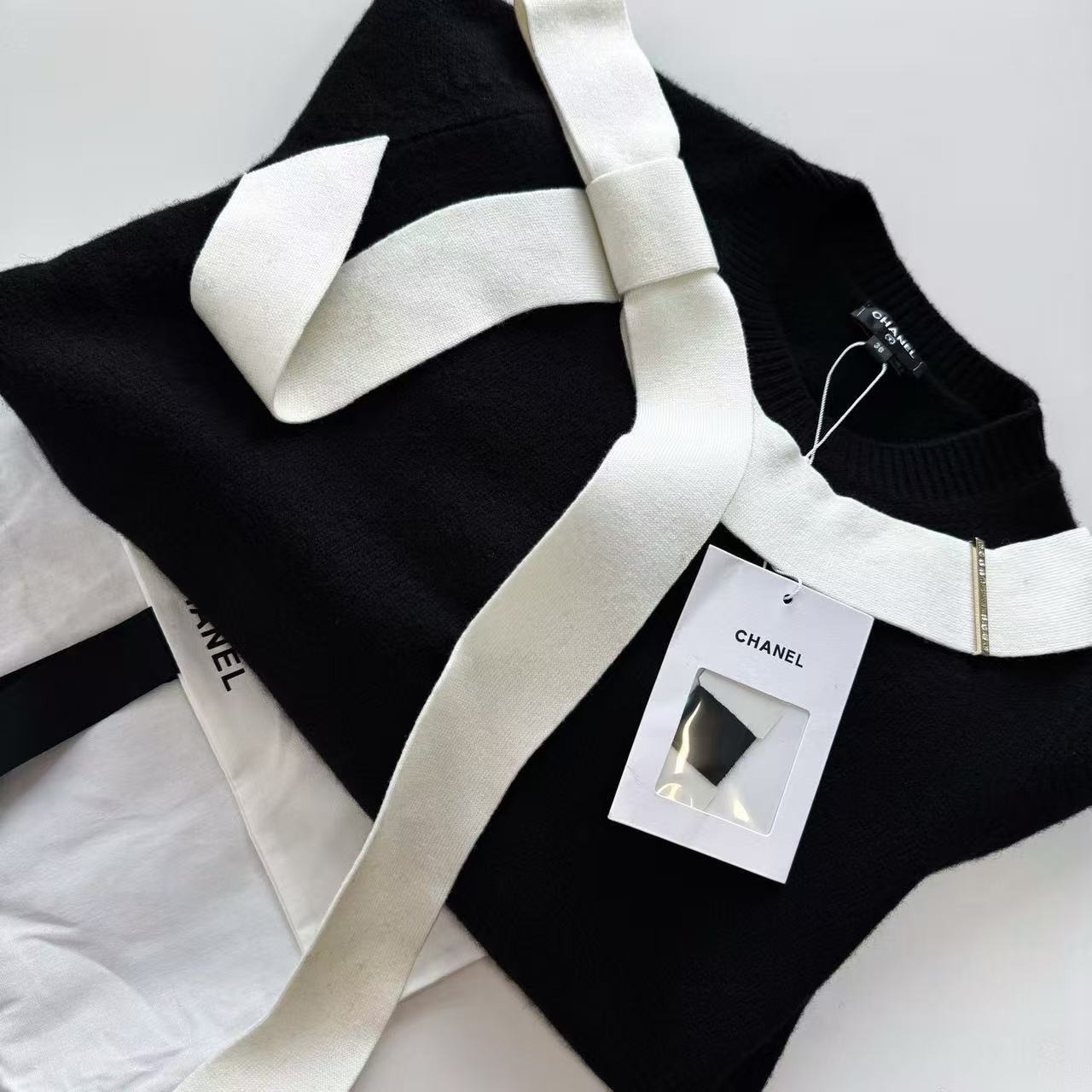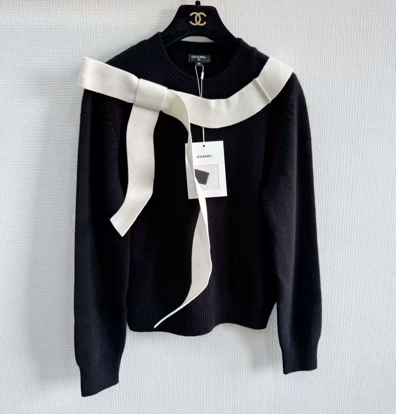 CHANEL 25k黑白拼色蝴蝶結羊絨毛衣冷衫