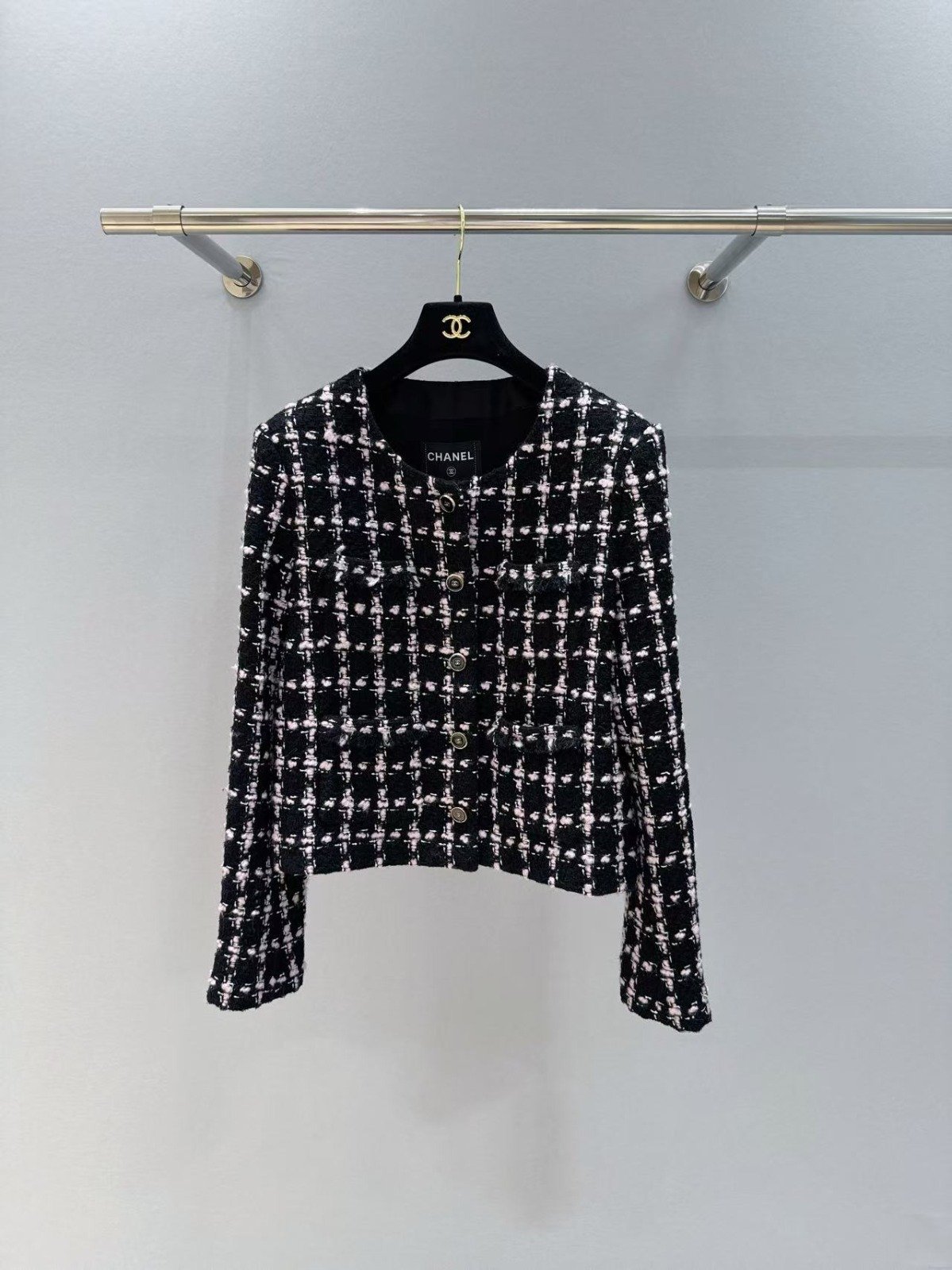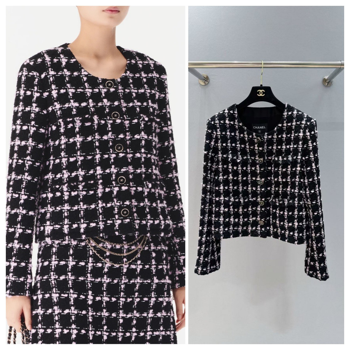 這件粗花呢外套一上身,立刻散發出優雅與嬌俏兼具的氣質 💖黑拼粉的花呢配色,既經典又帶點俏麗氣息,完美詮釋了CHANEL獨有的女性魅力 🌹