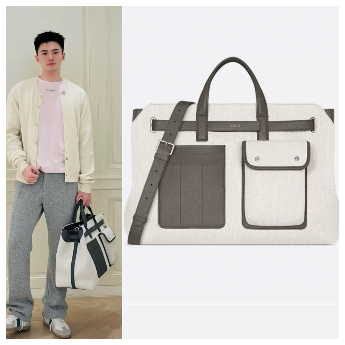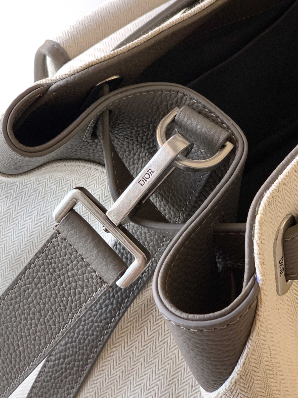 Dior Normandie 手袋將品牌的高級訂製精神與實用設計完美融合。包身採用米色人字紋棉帆布,並以灰色 Dior Icons 小牛皮裝飾。附有可調節的 Dior 皮革肩帶,可閉合或敞開,打造休閒造型。肩帶上的金屬孔眼飾有 Dior Normandie 標誌。精緻的細節,例如側面的圖案設計、底部的 Dior 標誌性鉚釘以及帶襯墊的頂部提手,更添這款手提包的優雅氣質。寬敞的內部空間設有兩個插袋和一個拉鍊口袋,內襯同樣採用人字紋布料。此外,還設有皮革插袋和一個翻蓋前袋。可調節且可拆卸的皮革肩帶,讓您輕鬆手提或肩背這款大手提包