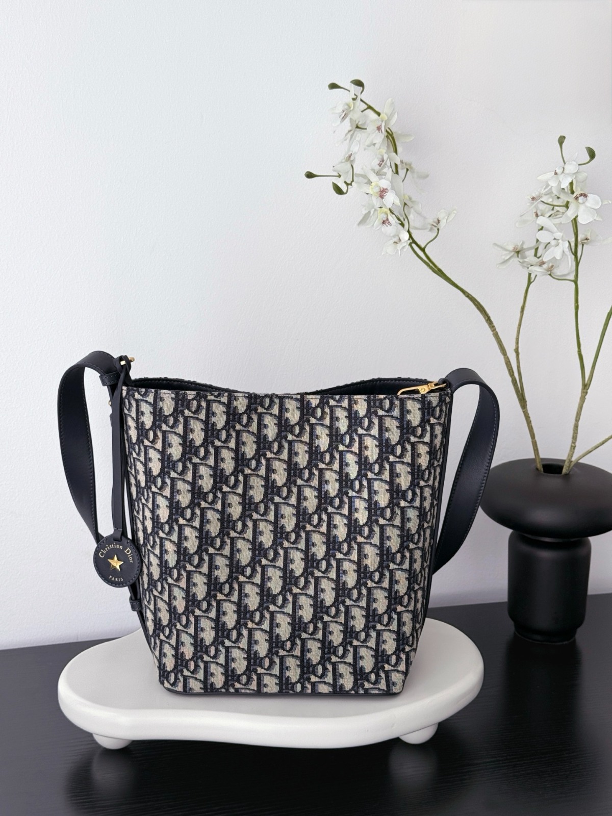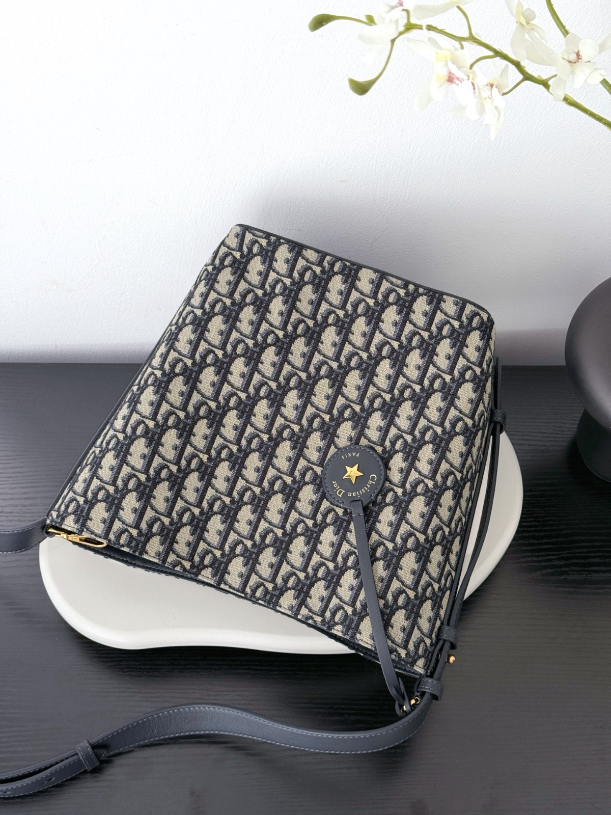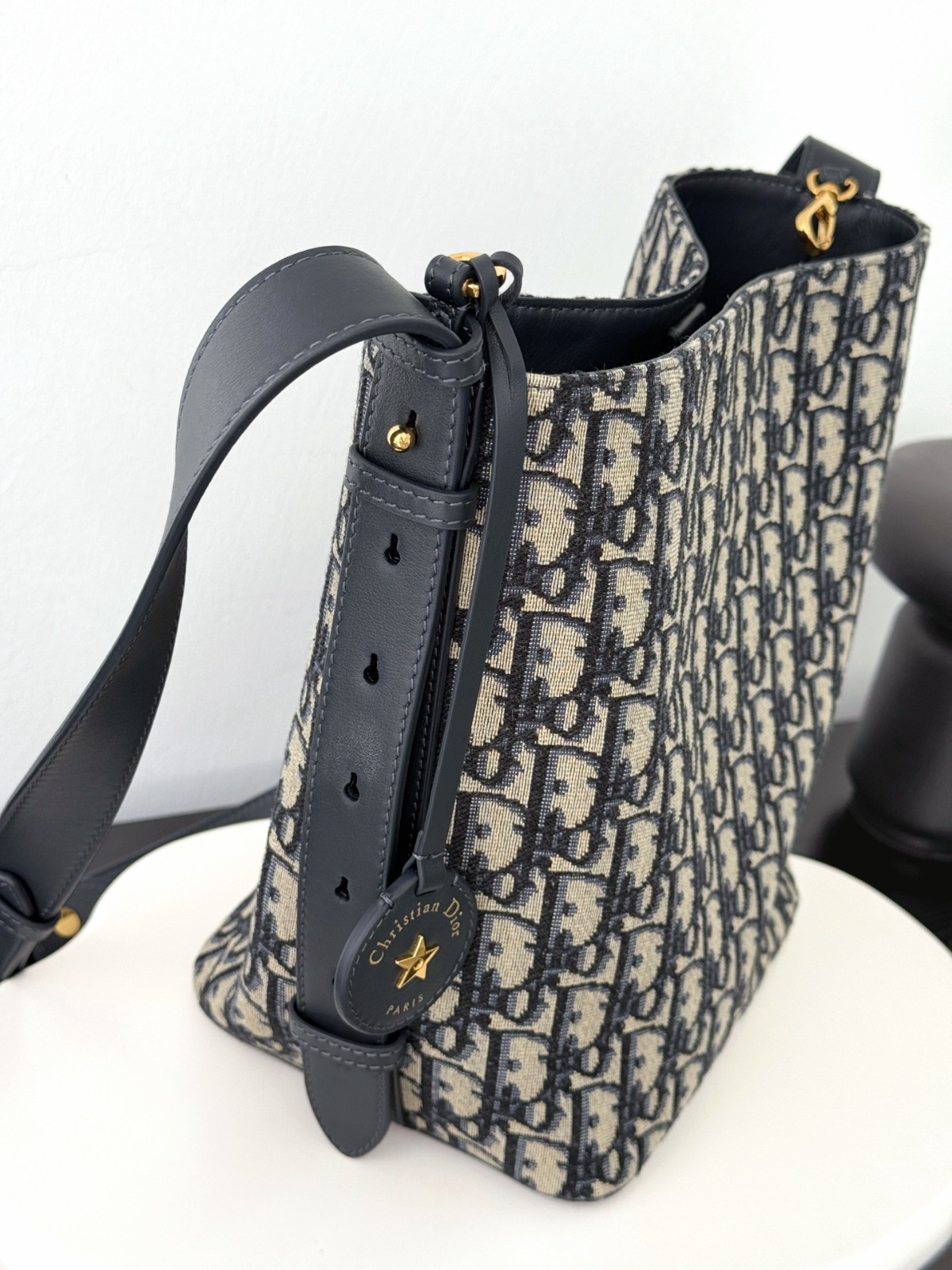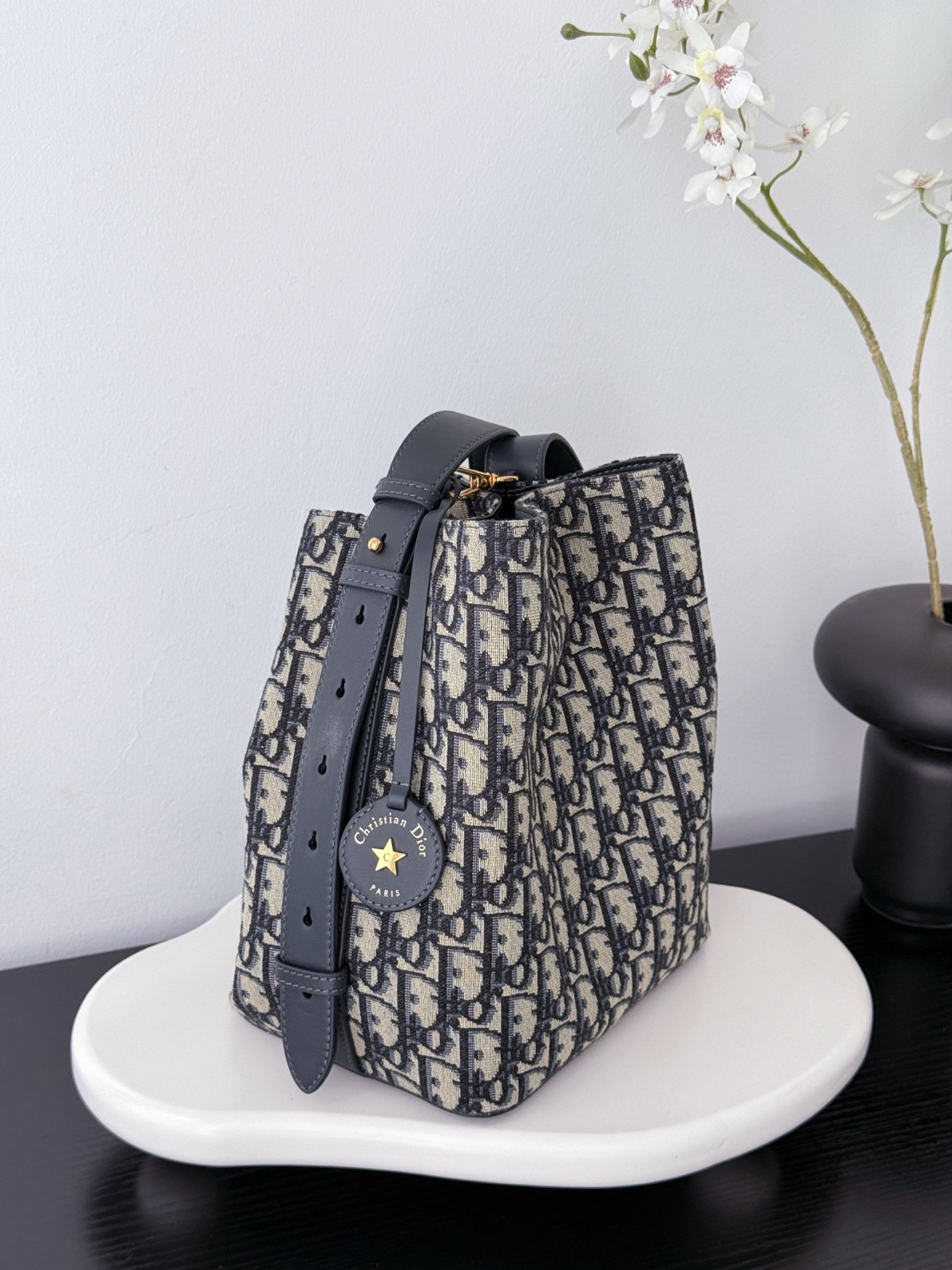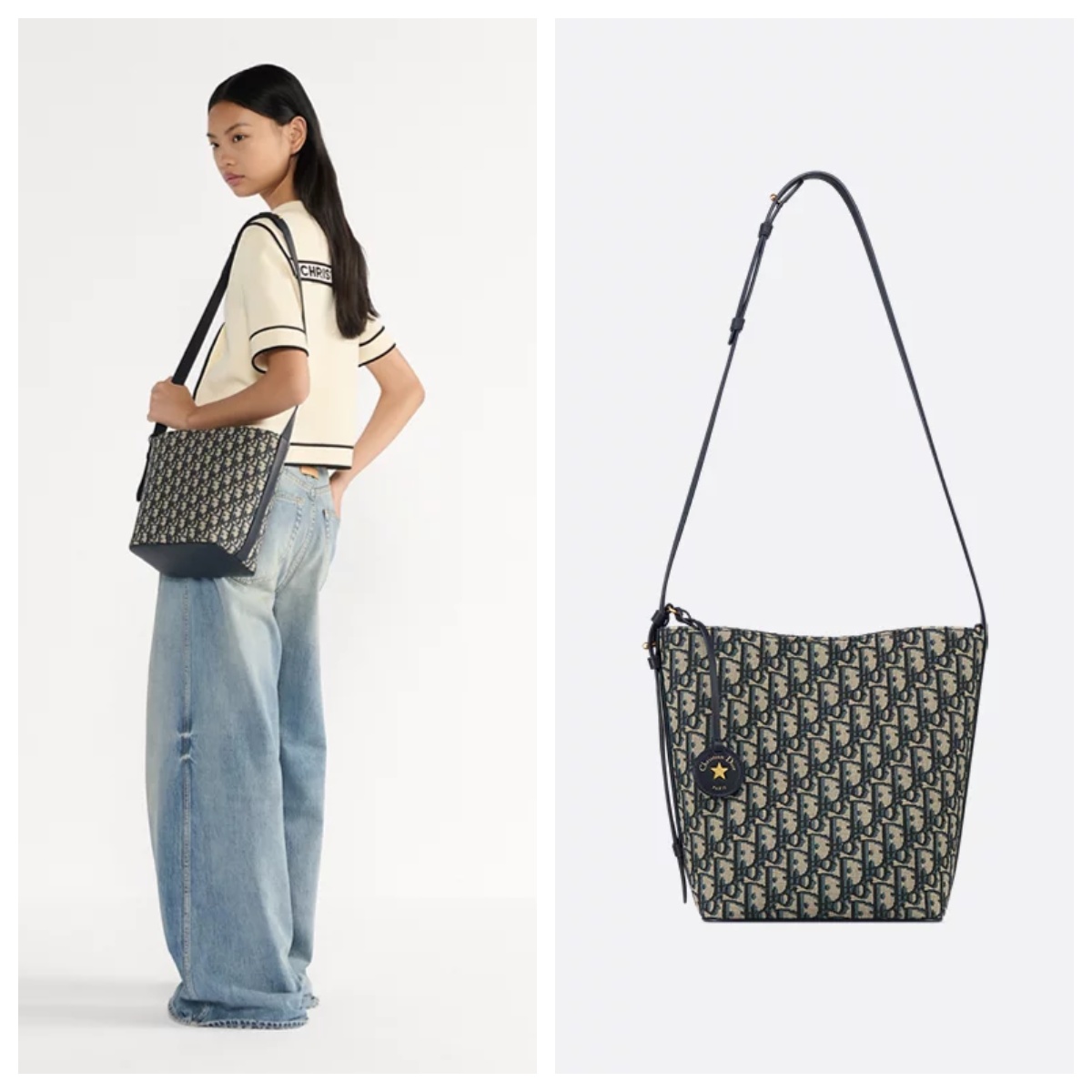 這款 Diorstar 小型水桶包是 2026 度假系列新品,設計輕巧實用,風格百搭多變,以藍色 Dior Oblique 緹花製成,搭配同色系光滑小牛皮細節,採用雙開合設計,方便調整造型。包款飾有 Christian Dior Paris 標誌和品牌幸運星皮革標籤,寬敞隔層可輕鬆收納所有必需品,搭配可調式皮革背帶,可舒適地手提、肩背或斜背