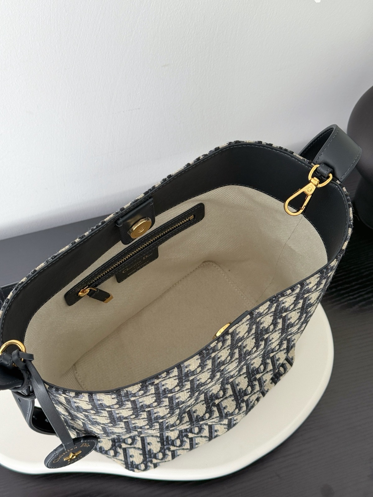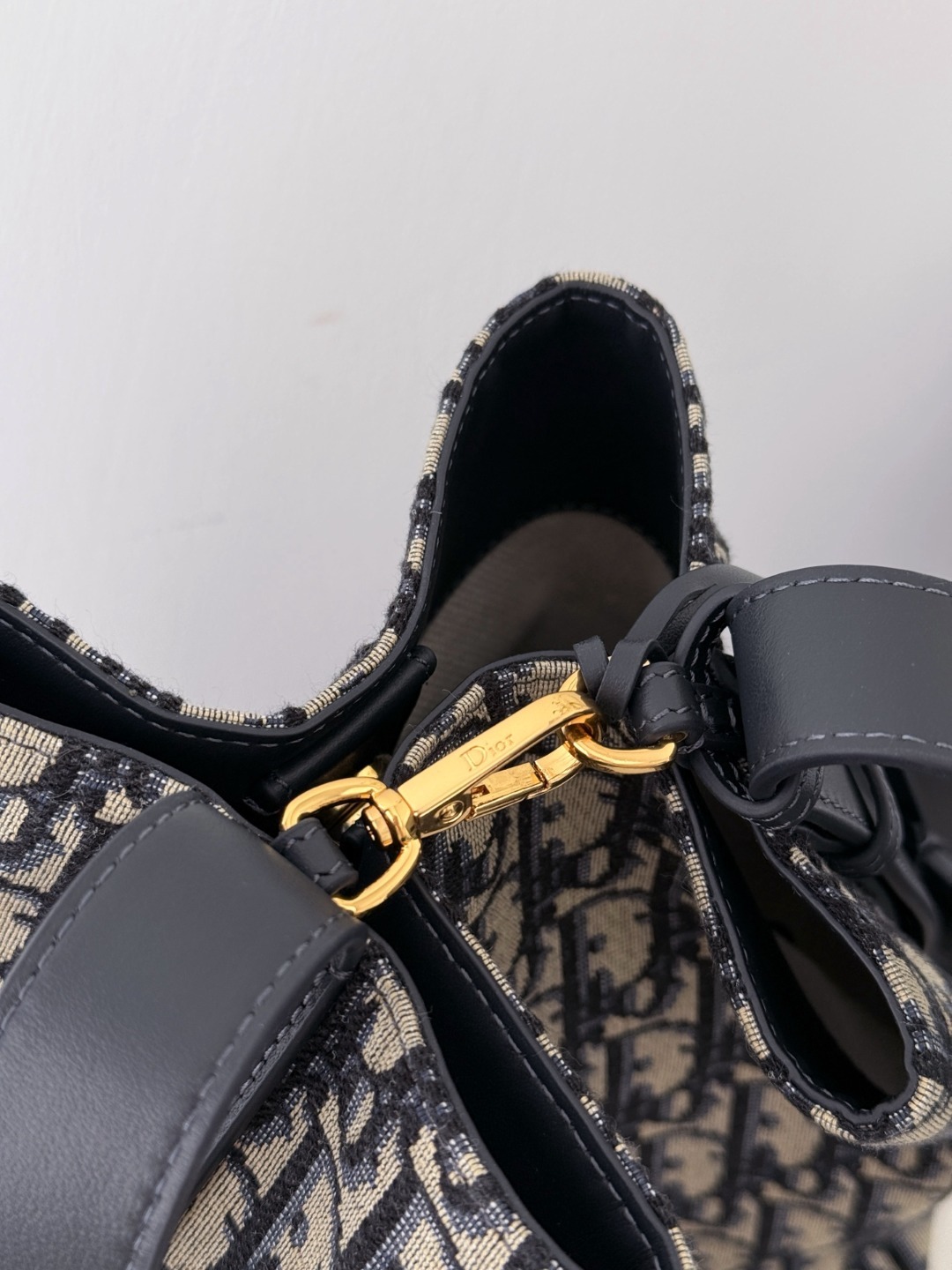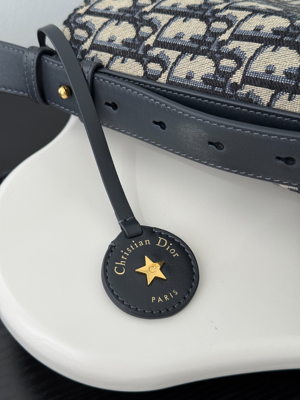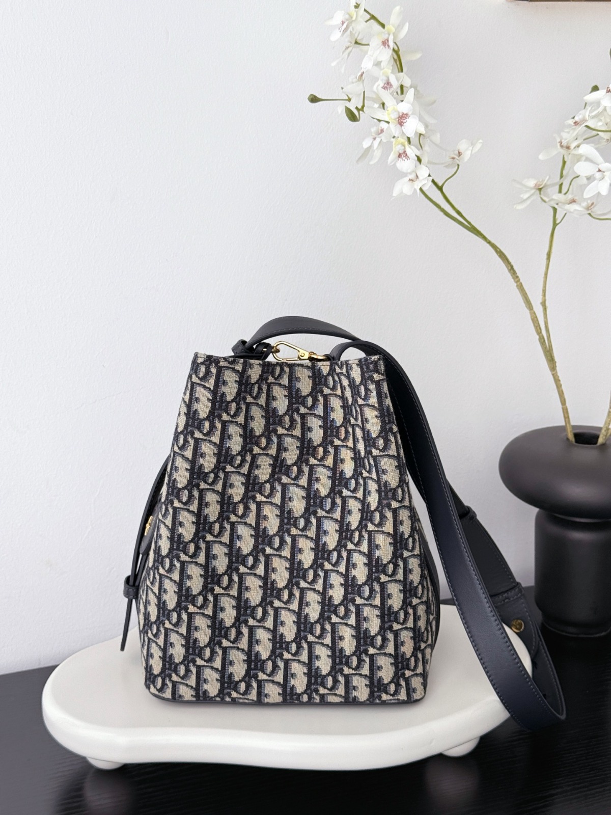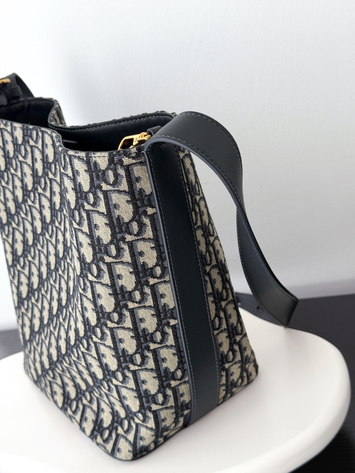 這款 Diorstar 小型水桶包是 2026 度假系列新品,設計輕巧實用,風格百搭多變,以藍色 Dior Oblique 緹花製成,搭配同色系光滑小牛皮細節,採用雙開合設計,方便調整造型。包款飾有 Christian Dior Paris 標誌和品牌幸運星皮革標籤,寬敞隔層可輕鬆收納所有必需品,搭配可調式皮革背帶,可舒適地手提、肩背或斜背