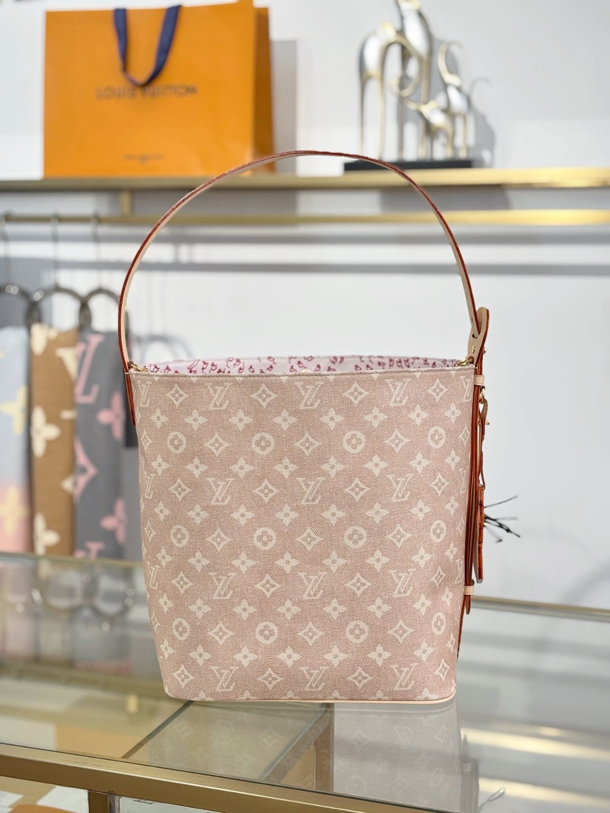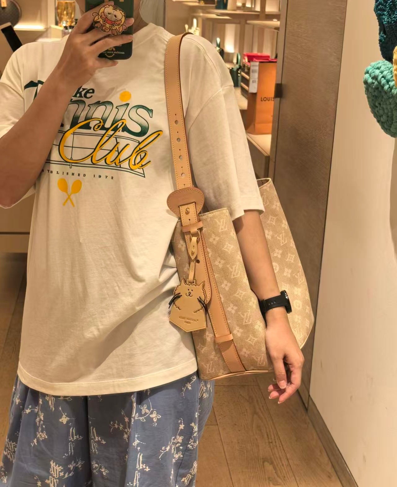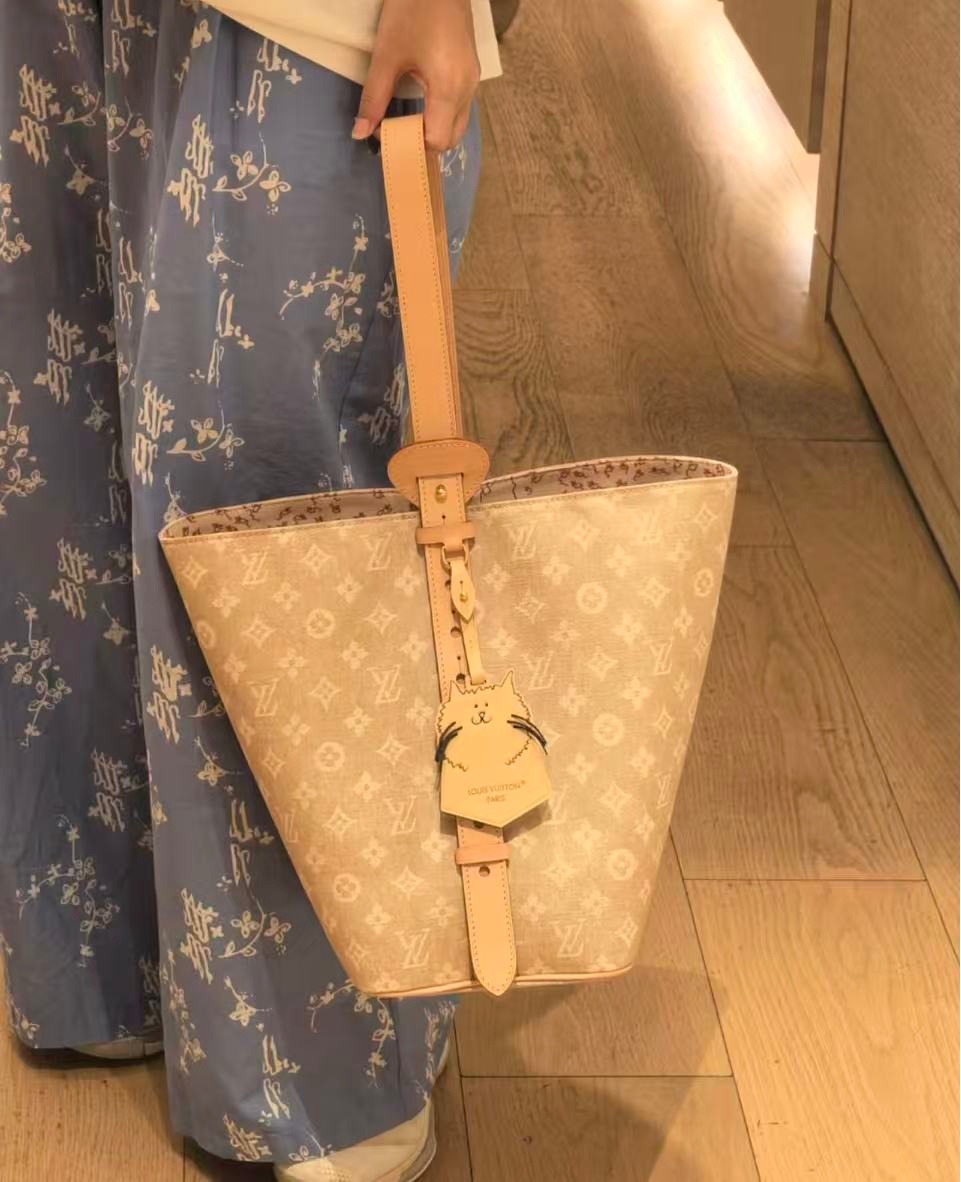 這個All In GM👜綴有由時尚名人兼藝術家Grace Coddington設計的品牌Meowgram標誌🐱此設計專為LV Travels With系列獨家打造,以帆布配以牛皮飾邊製成,並以玩味十足的貓形鑰匙套🐈作為點綴。水桶形設計容量適中,可收納日常所需物品🧺包括手提電腦💻並配備可拆式拉鍊收納包👛倍添實用💯。
