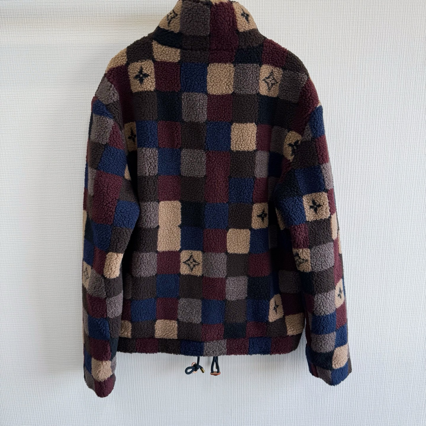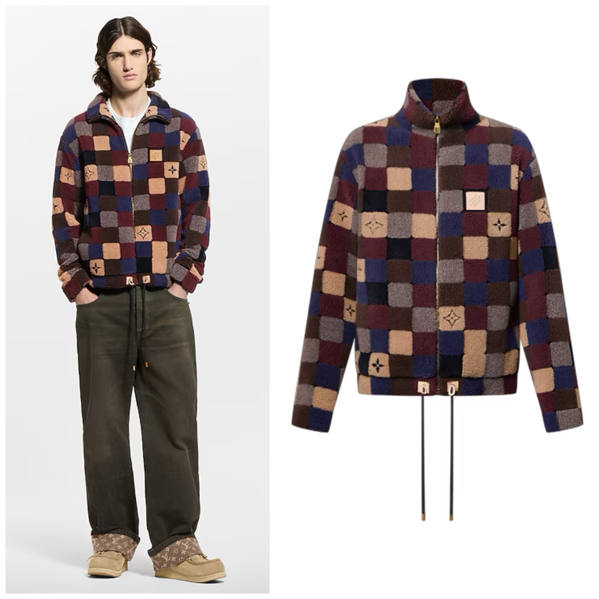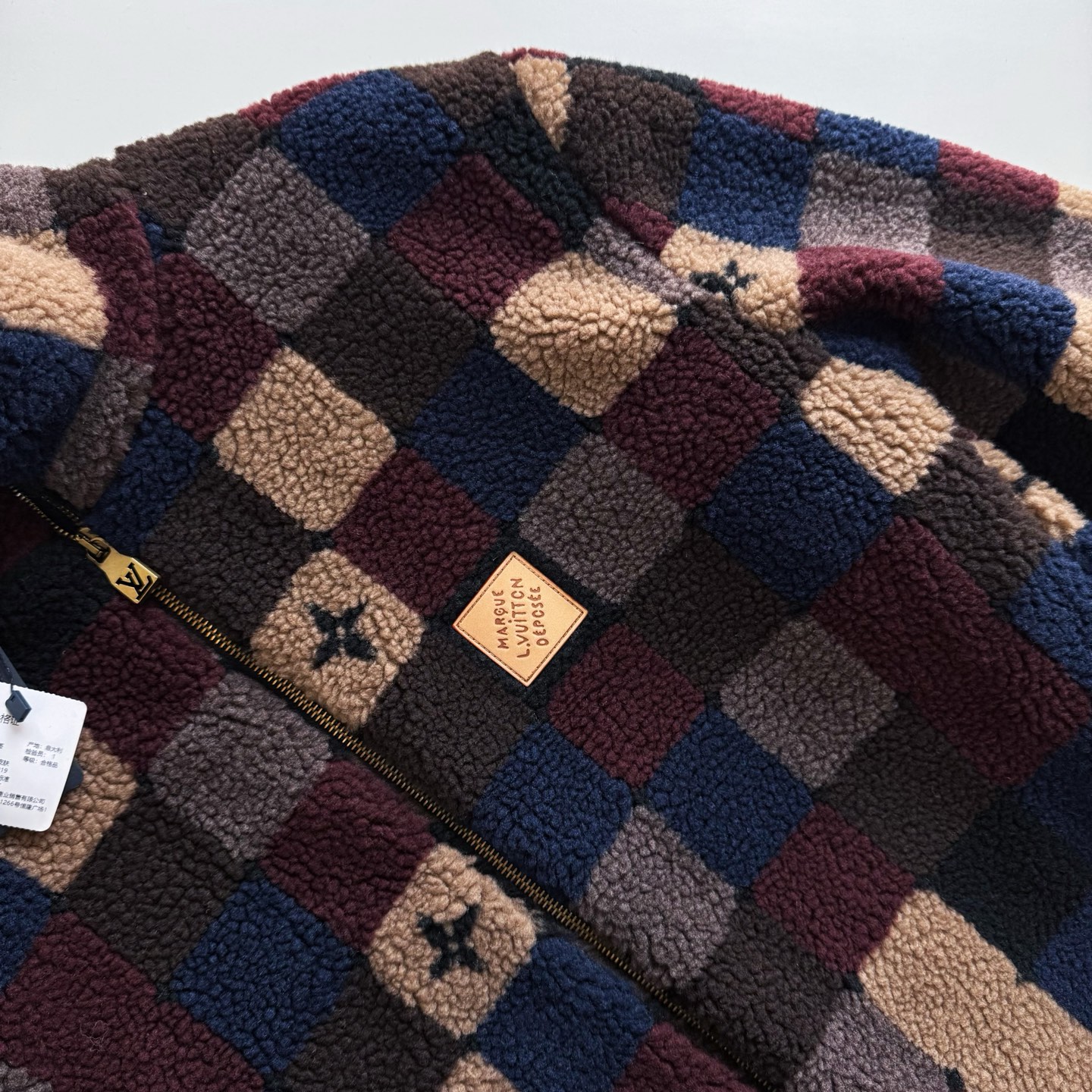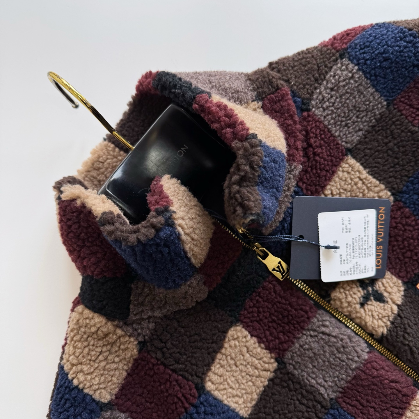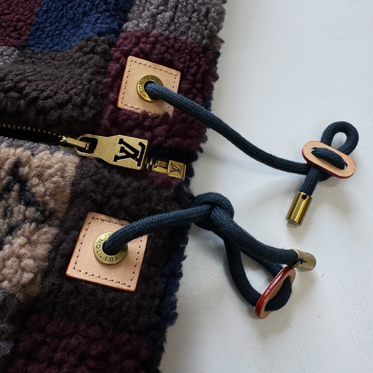 這款溫暖的搖粒絨拉鏈外套完美結合今季的舒適造型與幾何風的品牌標誌美學。衣身綴以Damier Pixel提花圖案,融入Monogram花卉圖案細節,以大地風的棕色調與藍色調交織而成。頸部採用保暖的高領設計,抽繩腰束腰飾有VVN色皮革調節扣,而襟前還點綴了VVN色皮革Marque L.Vuitton Déposée標誌貼章。