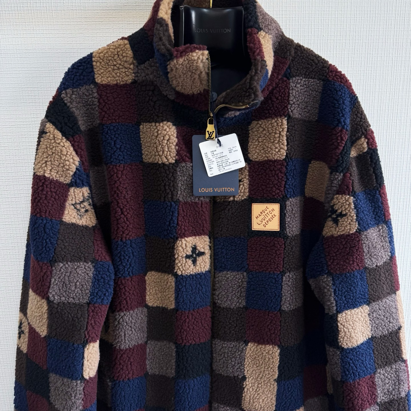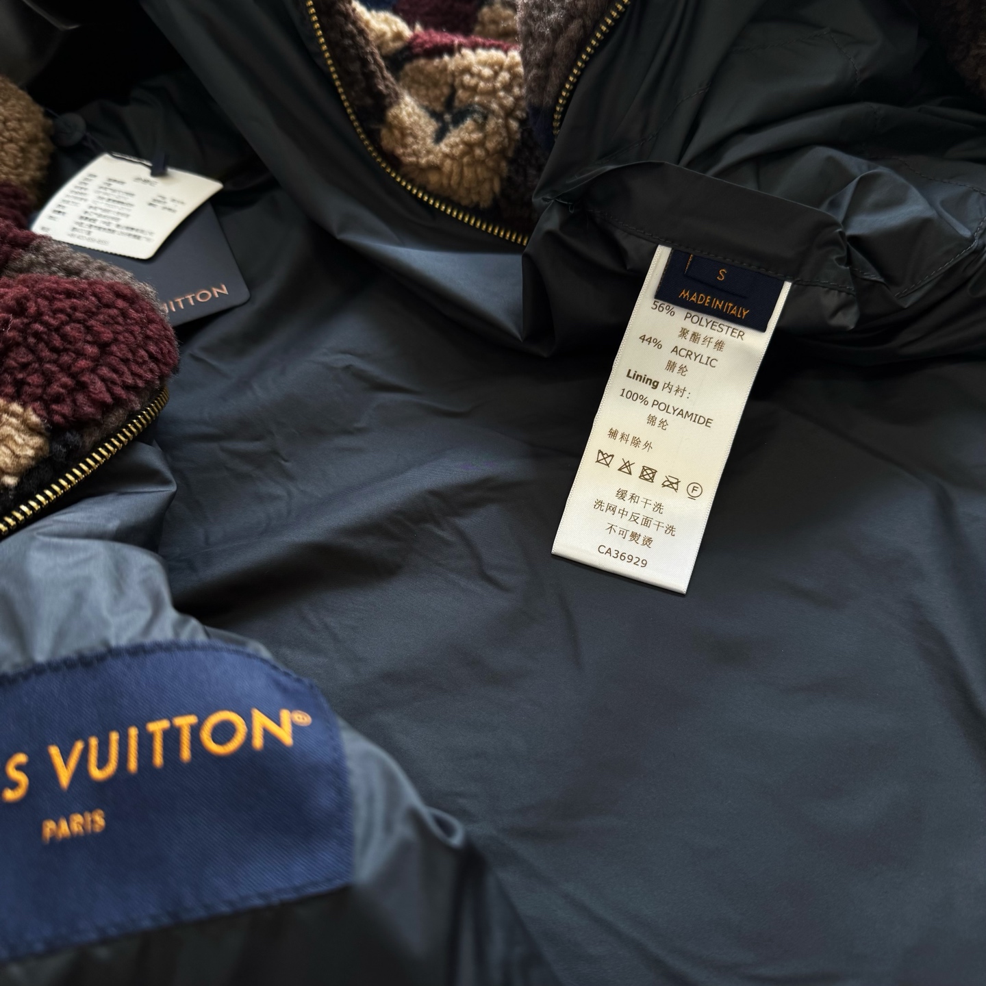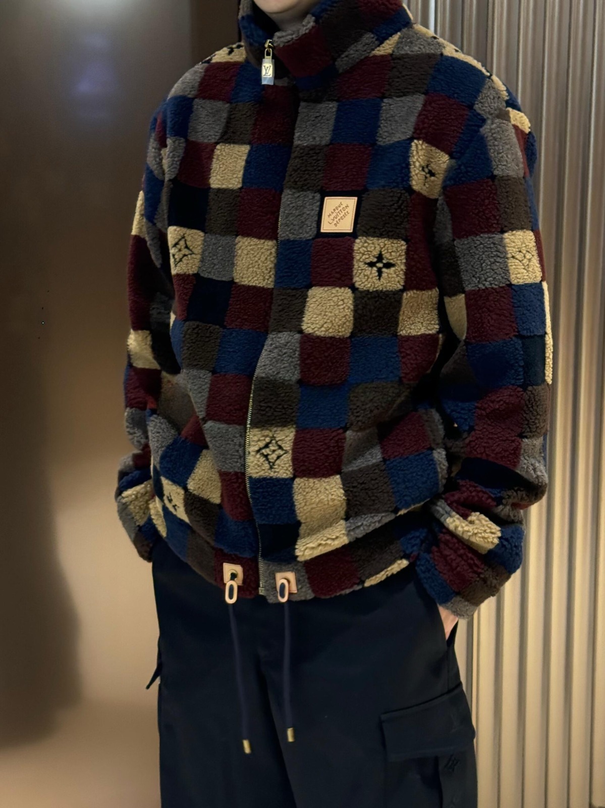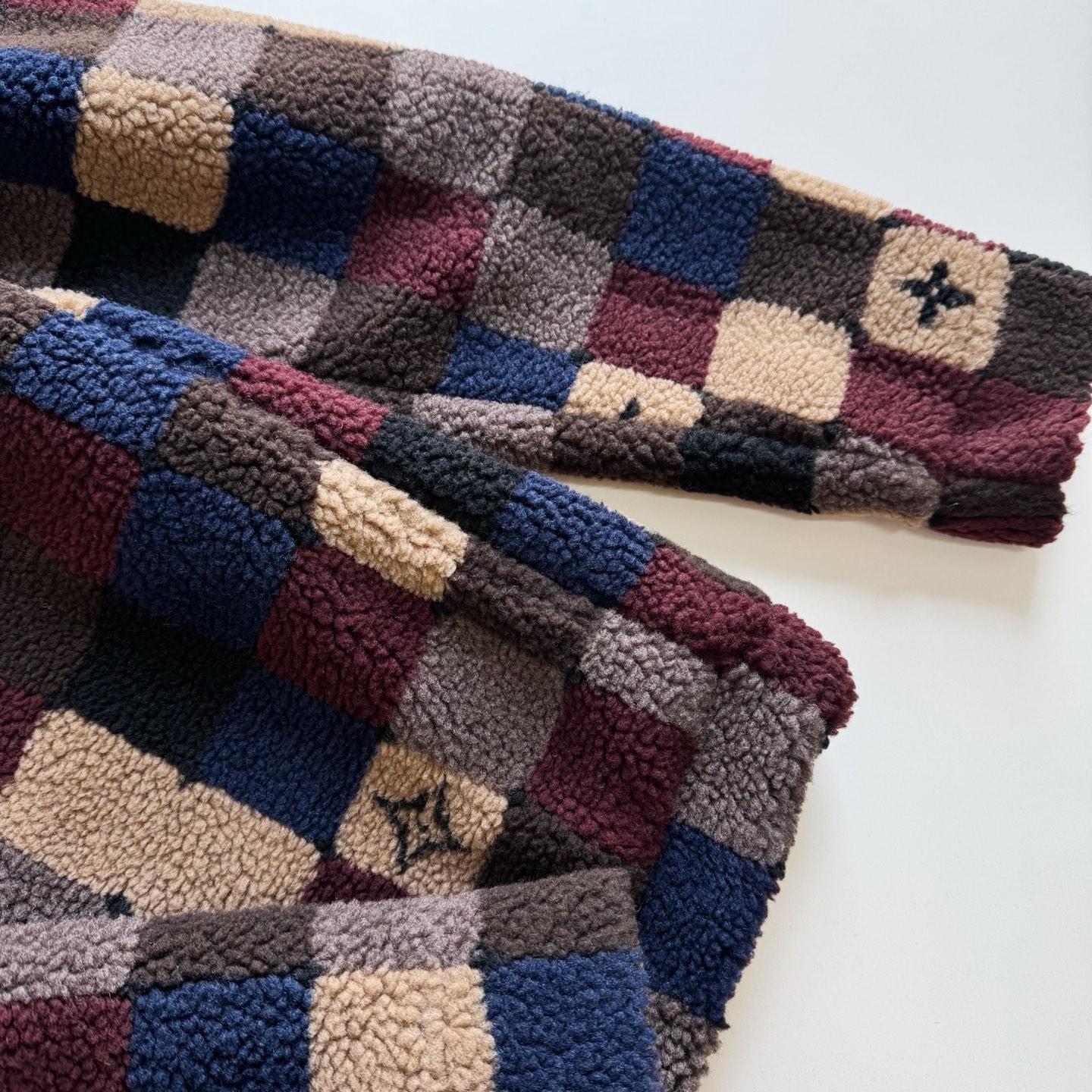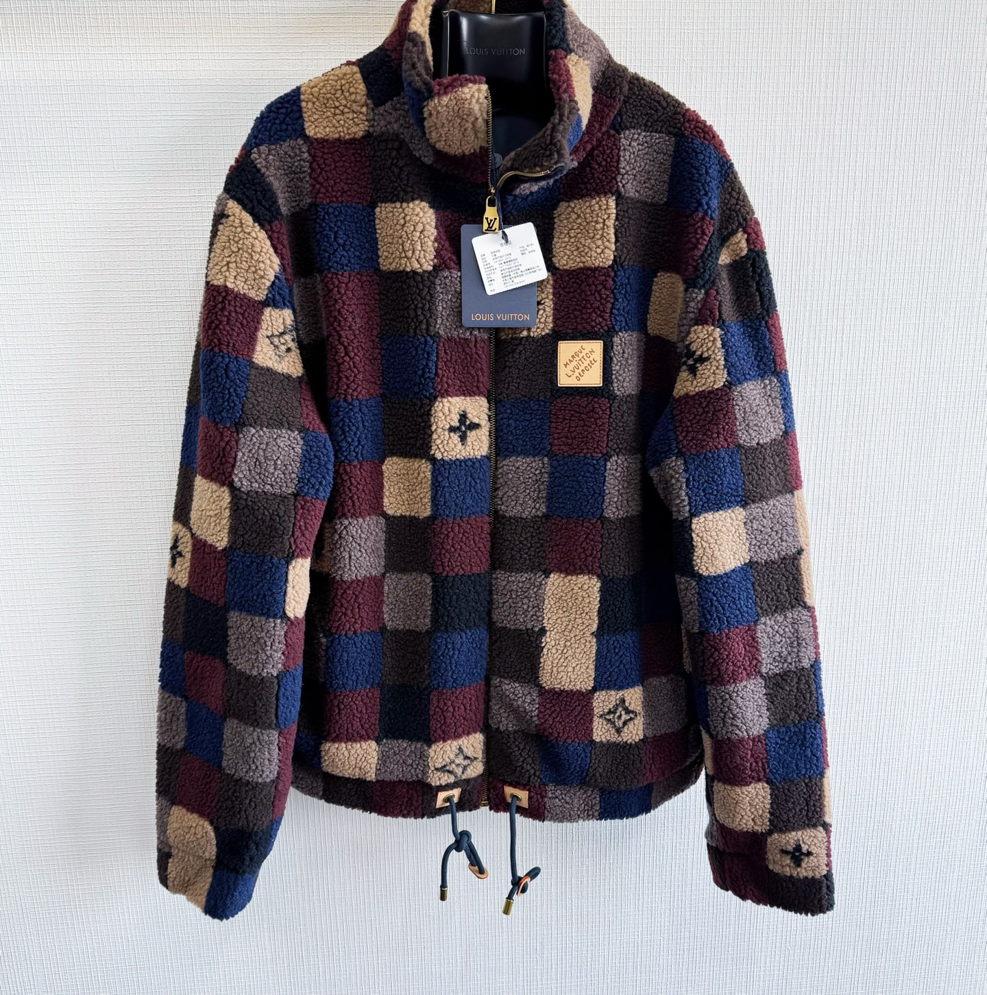 這款溫暖的搖粒絨拉鏈外套完美結合今季的舒適造型與幾何風的品牌標誌美學。衣身綴以Damier Pixel提花圖案,融入Monogram花卉圖案細節,以大地風的棕色調與藍色調交織而成。頸部採用保暖的高領設計,抽繩腰束腰飾有VVN色皮革調節扣,而襟前還點綴了VVN色皮革Marque L.Vuitton Déposée標誌貼章。
