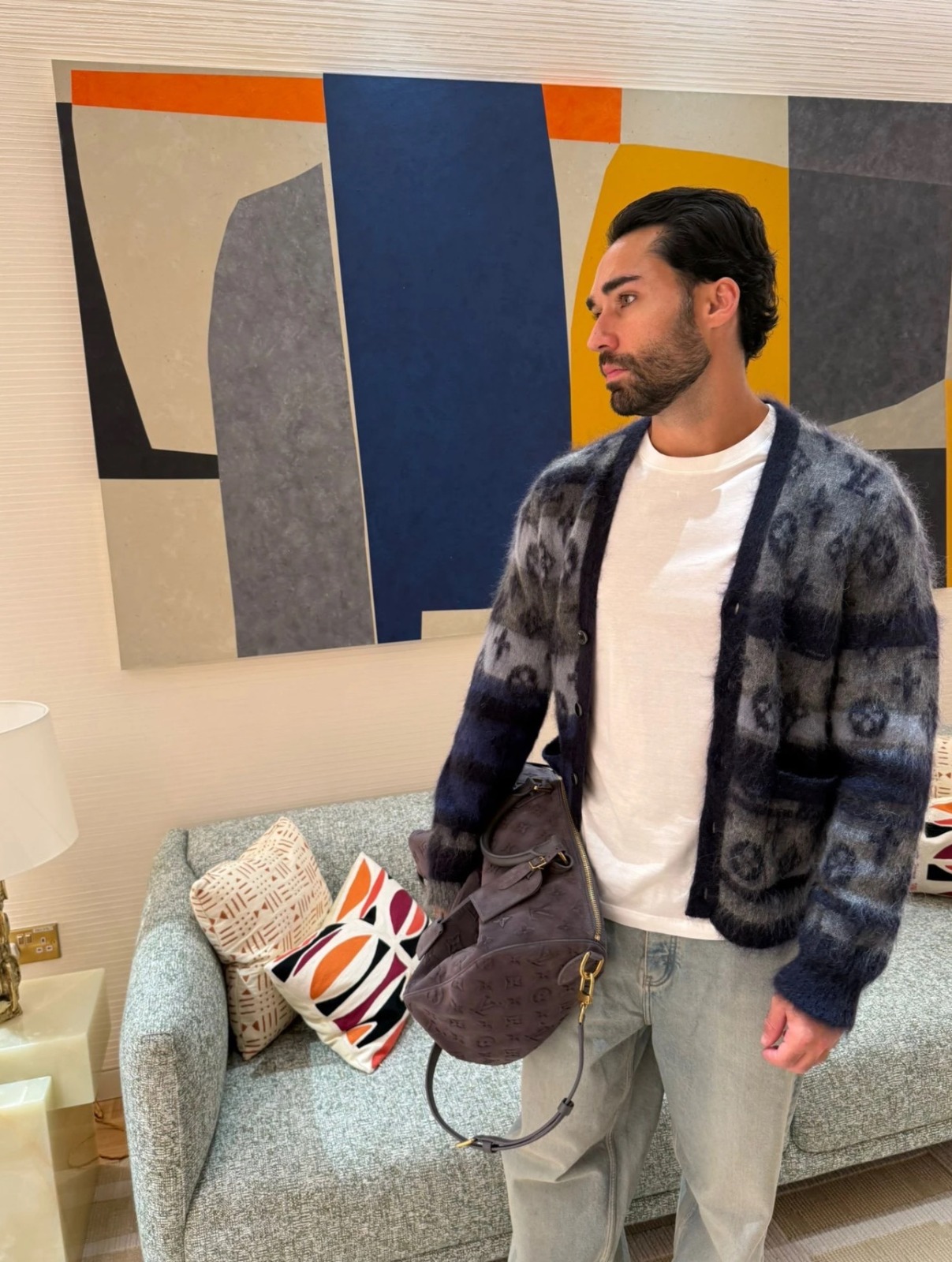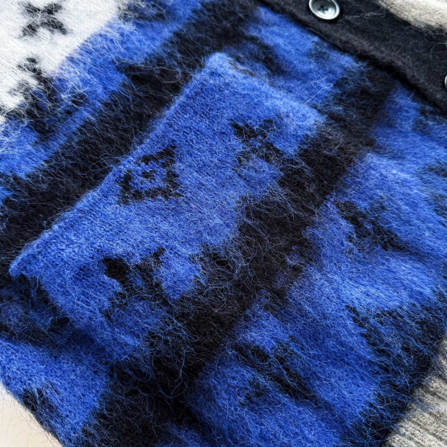這款舒適的開襟外套採用優雅的藍色設計,並綴滿幾何風的黑色Monogram圖案。設計以細緻刷絨馬海毛製成,手感厚實。這件保暖外衣為雋永造型注入亮眼特色,無論配搭純色休閒服飾或西裝剪裁長褲都同樣出眾。
