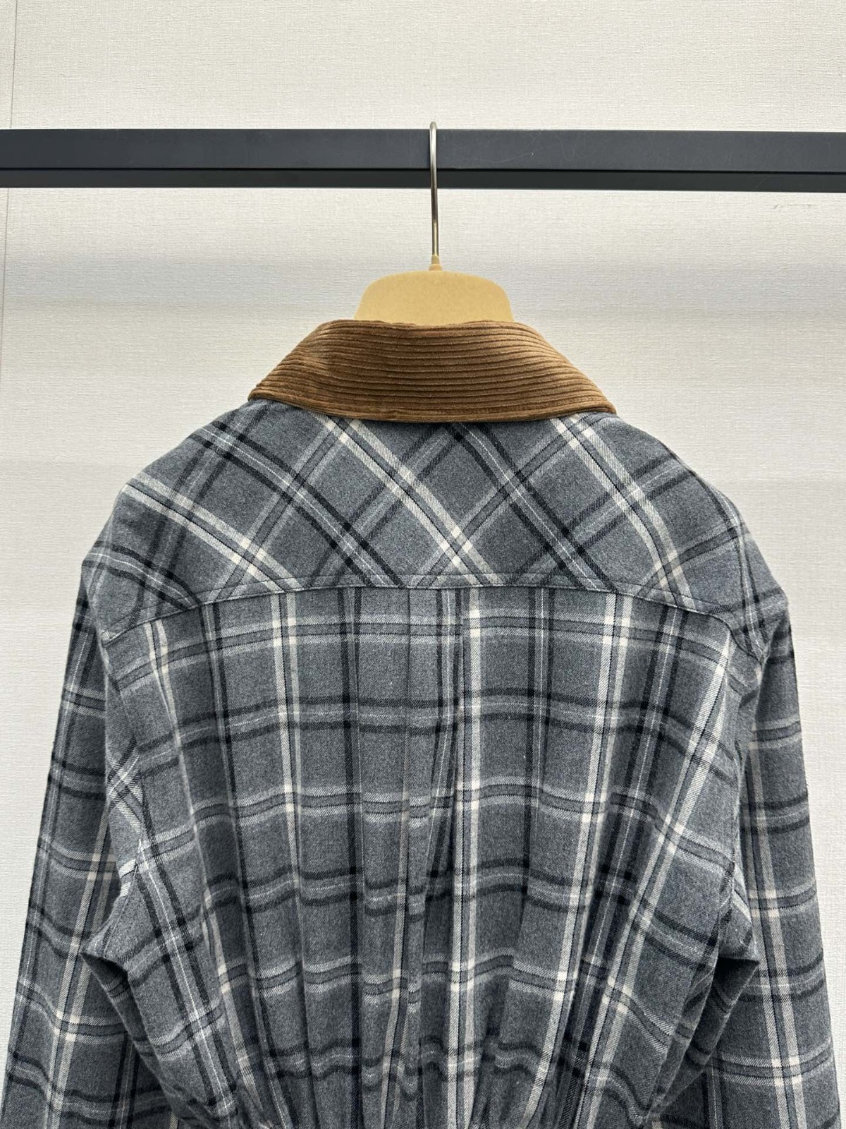 靈感源自男士襯衫,這款法蘭絨《女性服裝》結合女性化剪影、合身腰部及燈芯絨衣領和刺繡皮革標誌等經典細節,展現經典復古魅力。