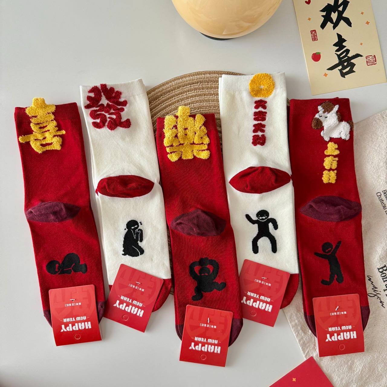 新年幸運襪🧦 紅色踩腳底小人中筒襪(一套5對)
