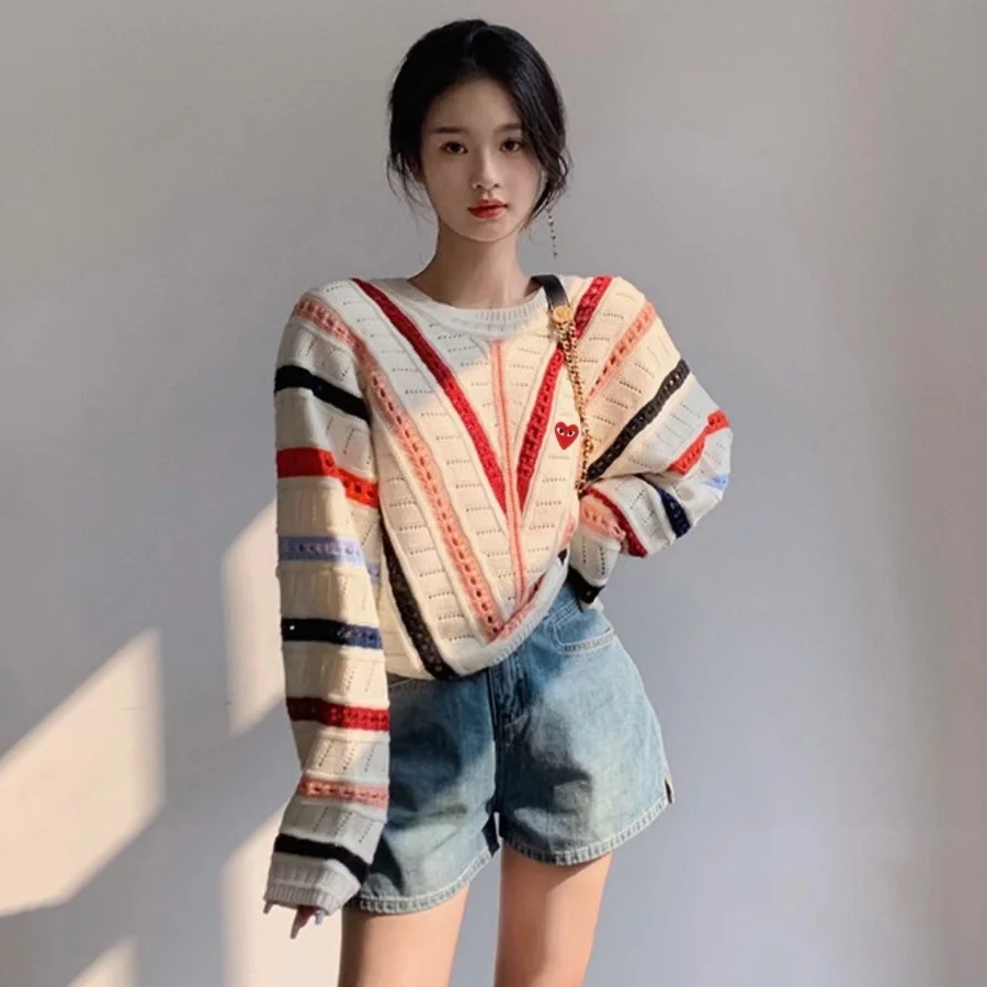 日本🇯🇵 CDG PLAY 彩虹條紋鏤空鈎花圓領冷衫