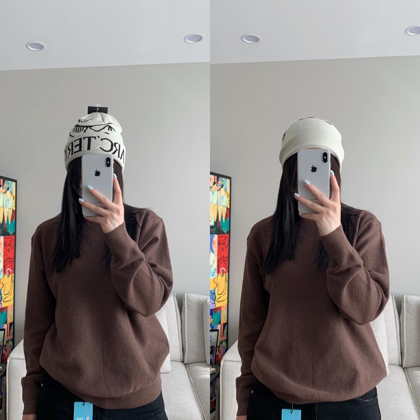 2 全部放下,字母面入內佩戴(始祖鳥logo面),這個戴法高級感多一些,完全成為冷帽,就很時髦