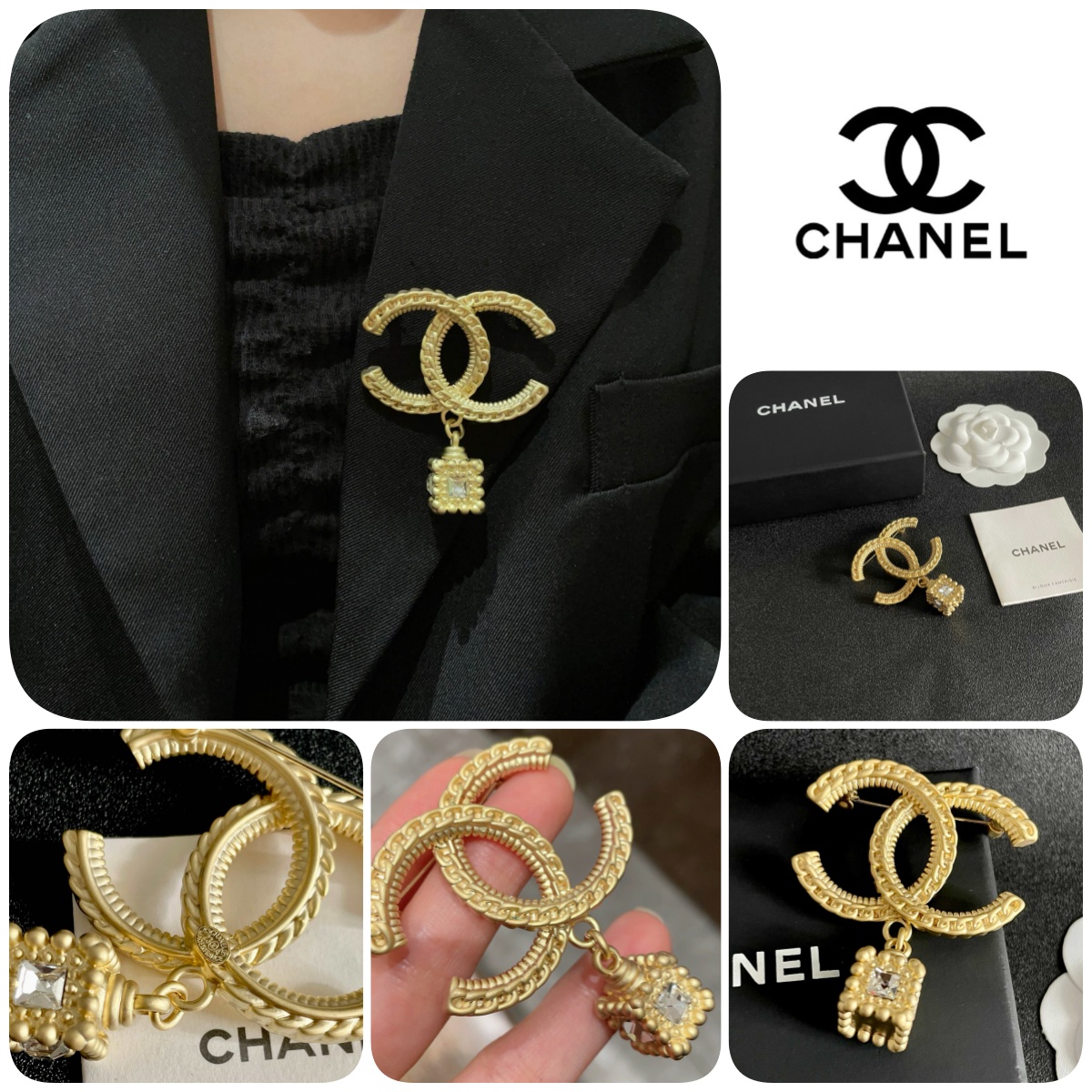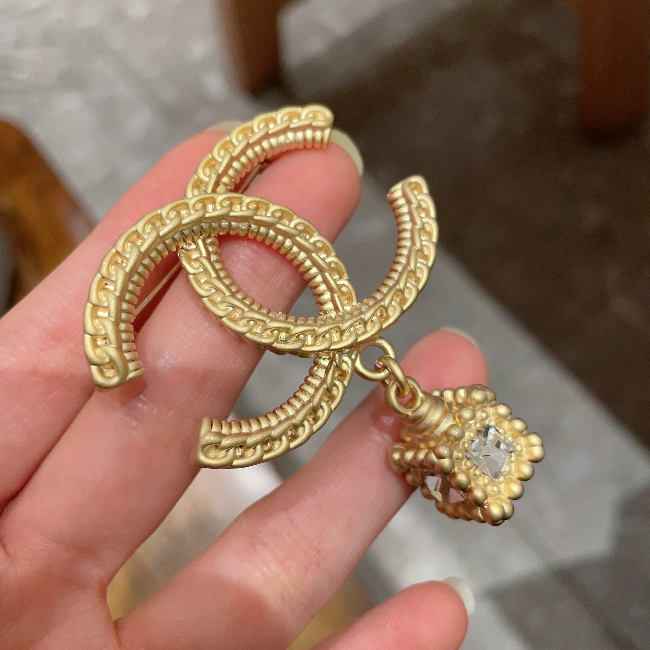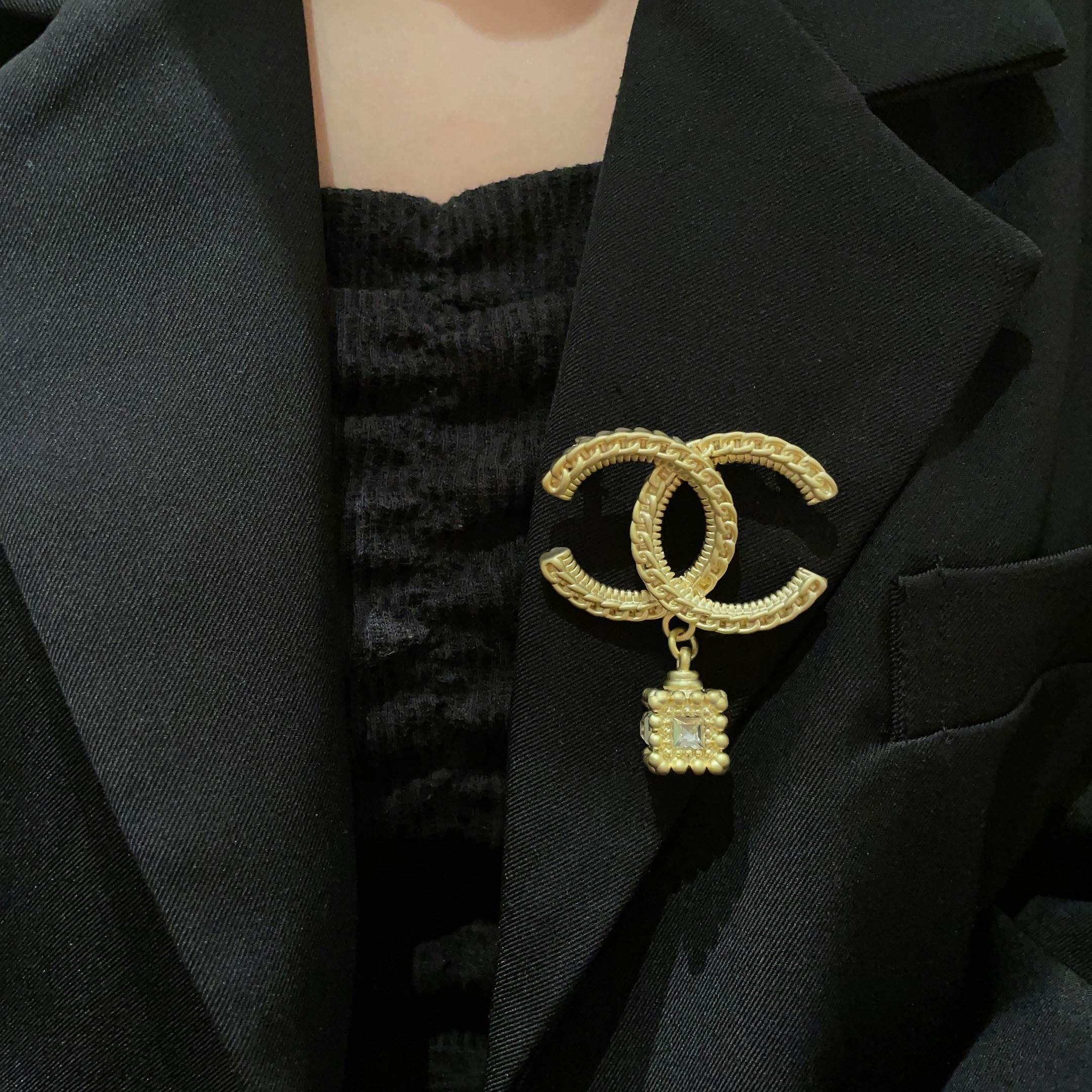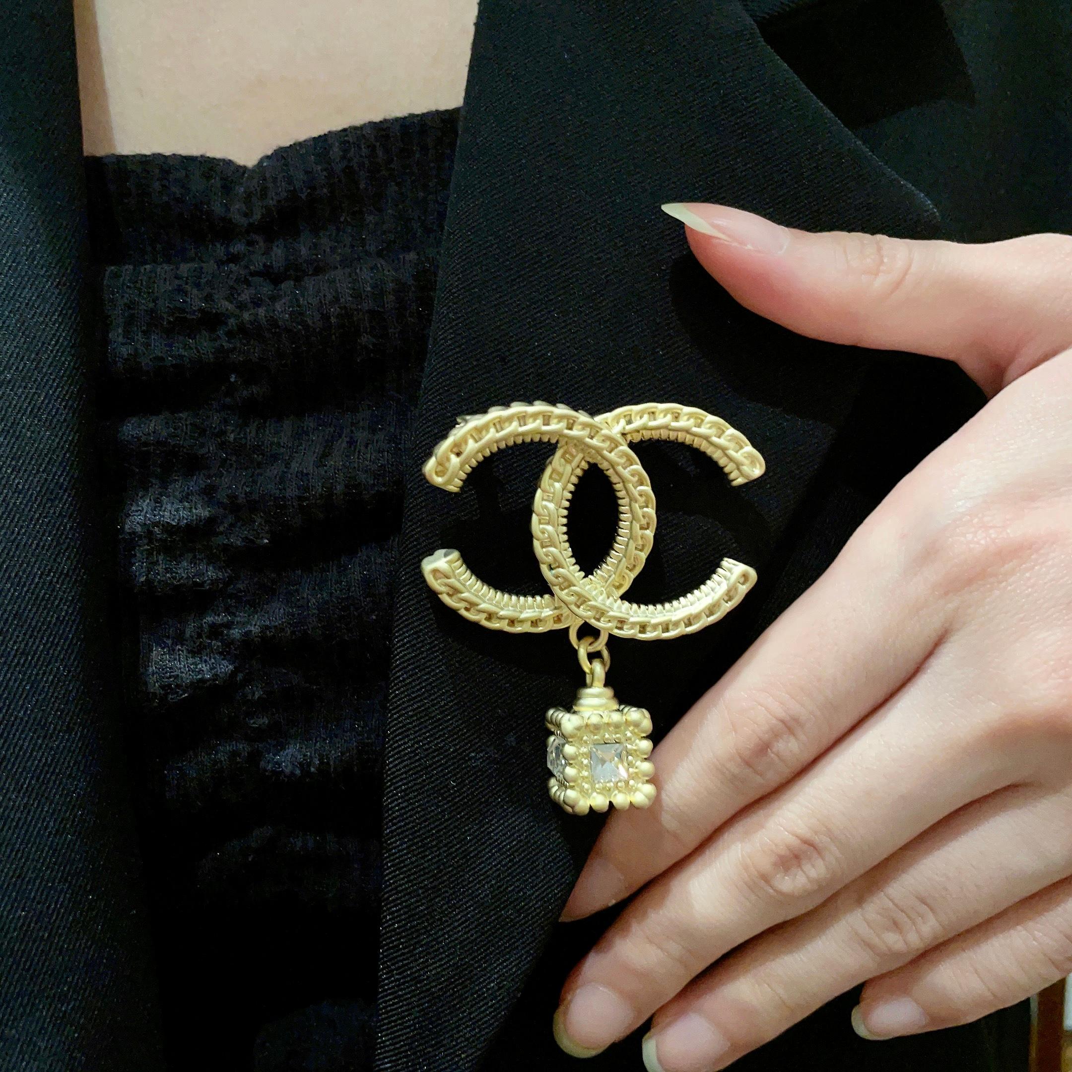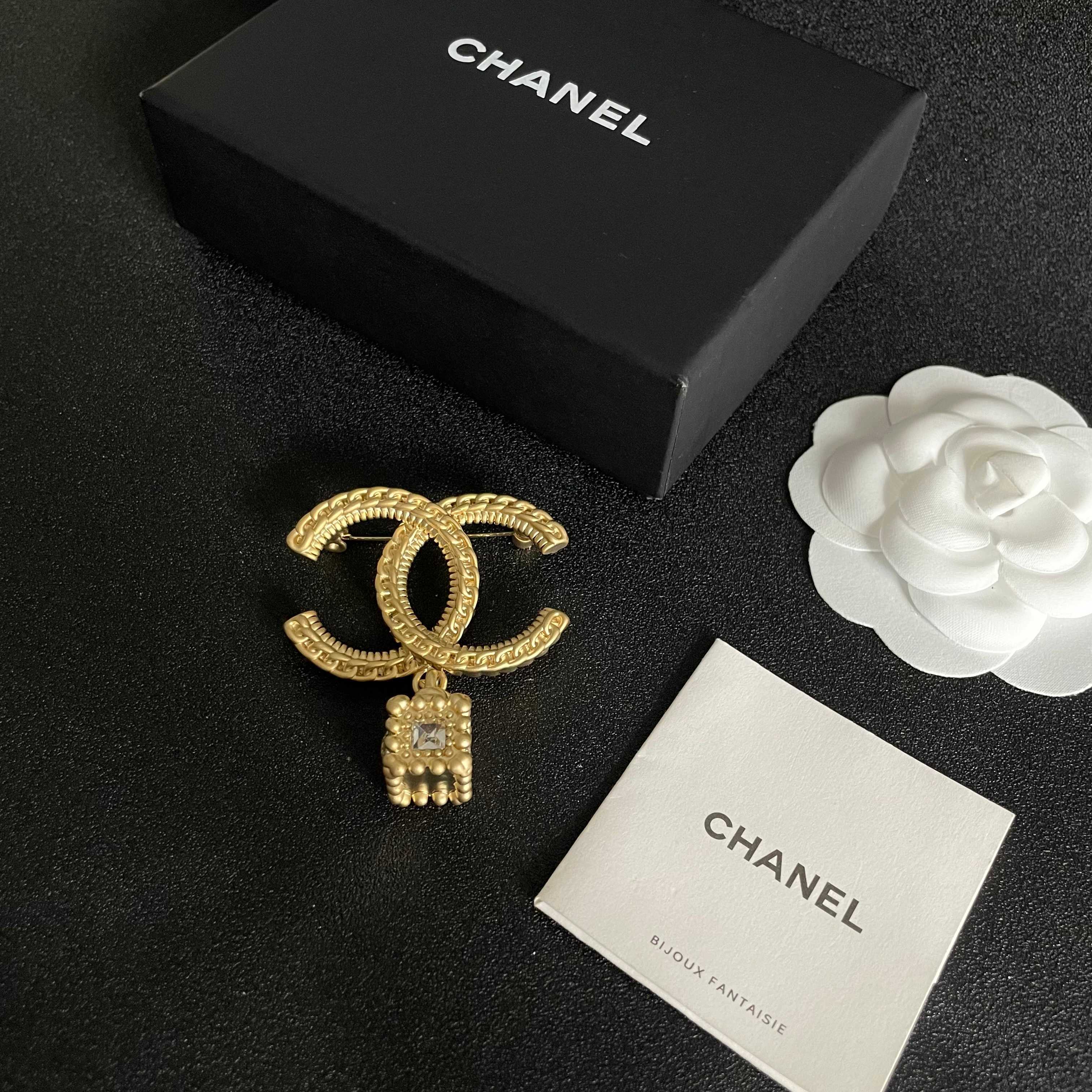 CHANEL 鍊條CC吊方形鋯石胸針 連禮盒