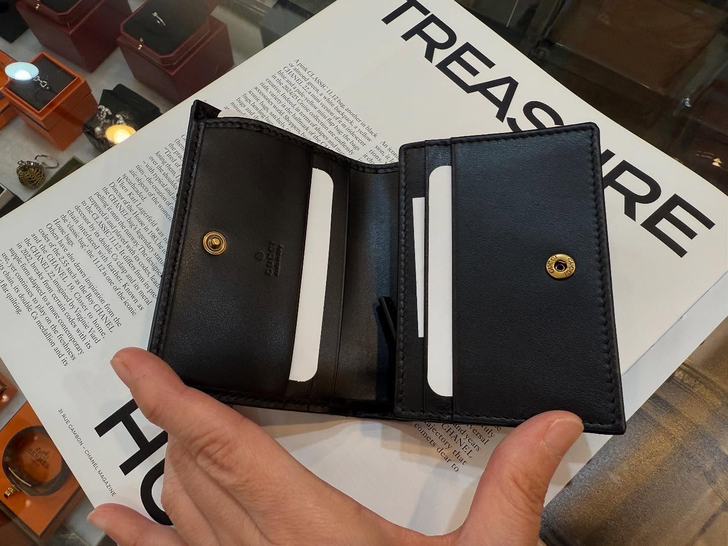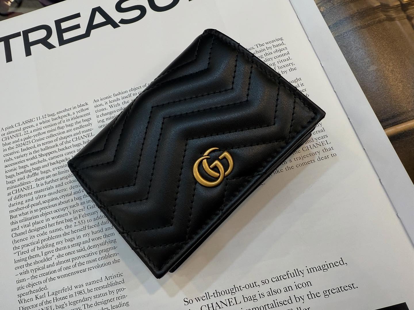 Gucci家最暢銷的 GG Marmont 系列✨相當適合用來當作精品皮夾的入門款👛採用黑色絎縫牛皮革搭配V形紋設計,並飾有仿舊金屬處理GG logo🌟讓原本感覺較溫柔的銀包,帶有一絲粗獷感💪擁有5個卡片夾層💳和1個鈔票隔層💵2個獨立的內部隔層🗂️絕對是耐裝第一🎉💯