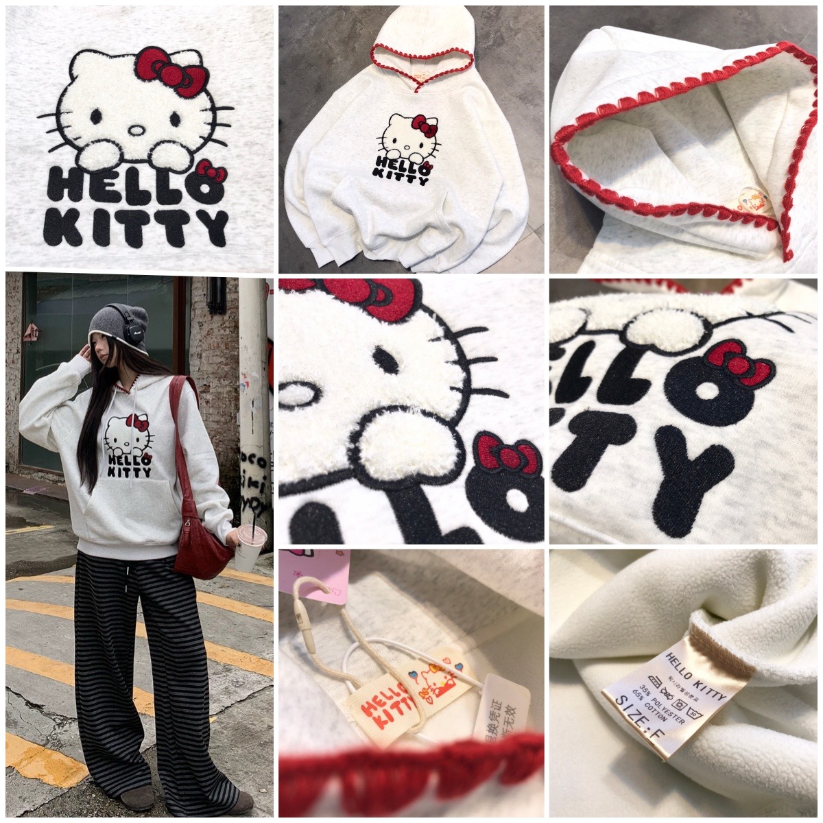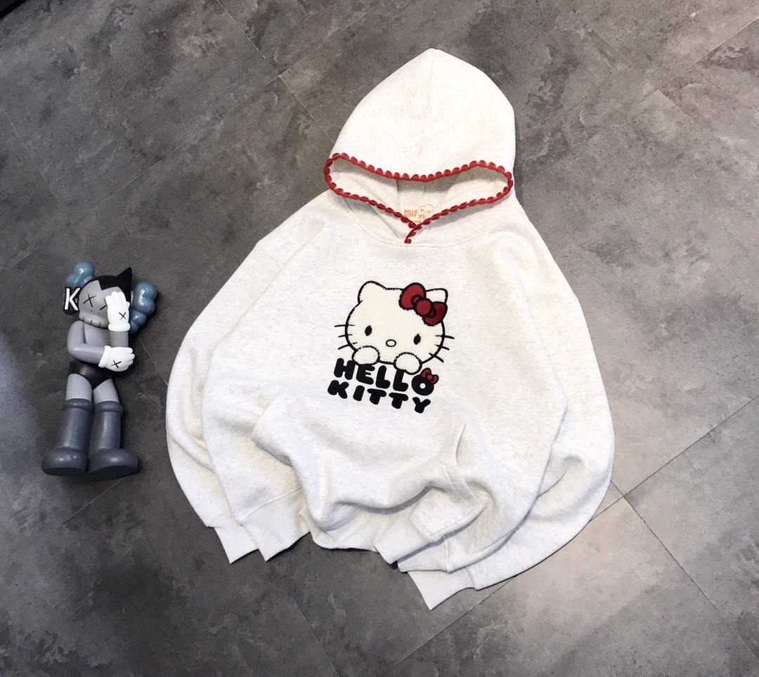 HELLO KITTY 紅色手縫毛線帽檐加絨連帽衛衣