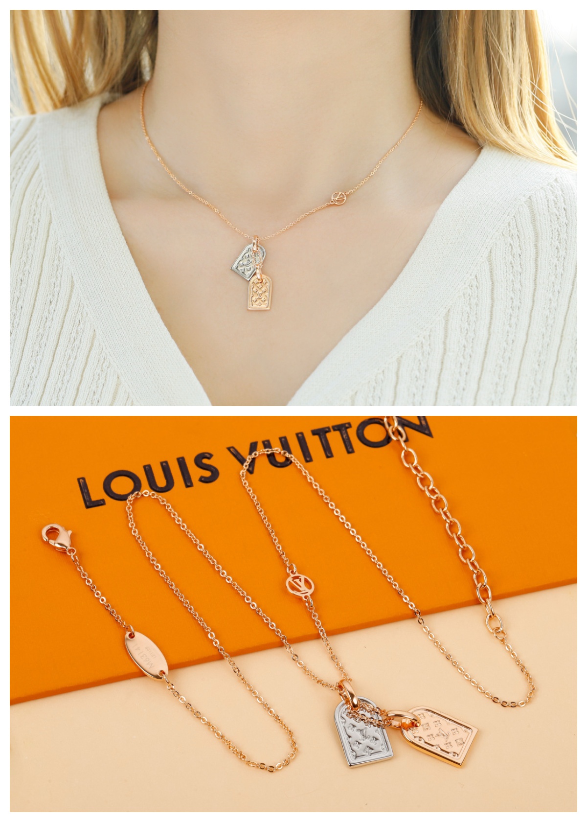 這款奈米圖案項鍊配有金銀相間的名字吊牌,醒目的設計融合了玫瑰金和銀色飾面,鏈條部分也飾有LV標誌。