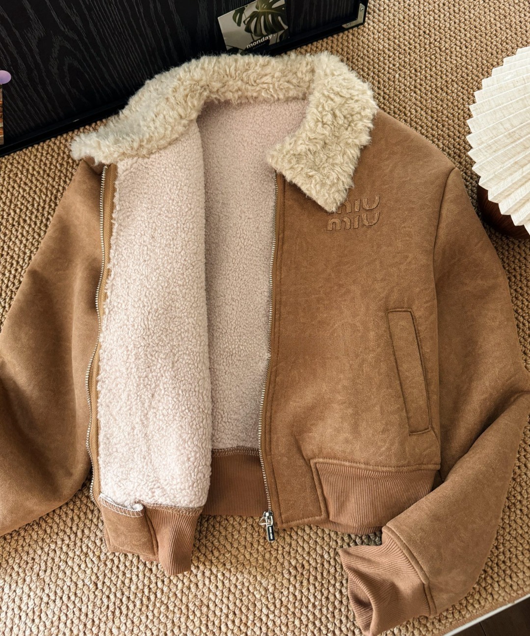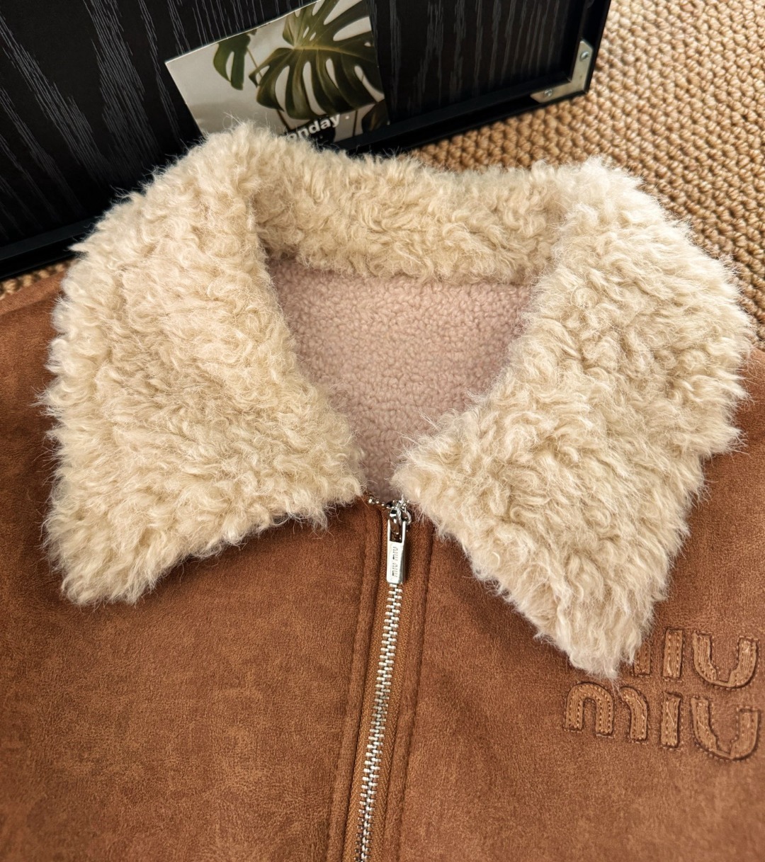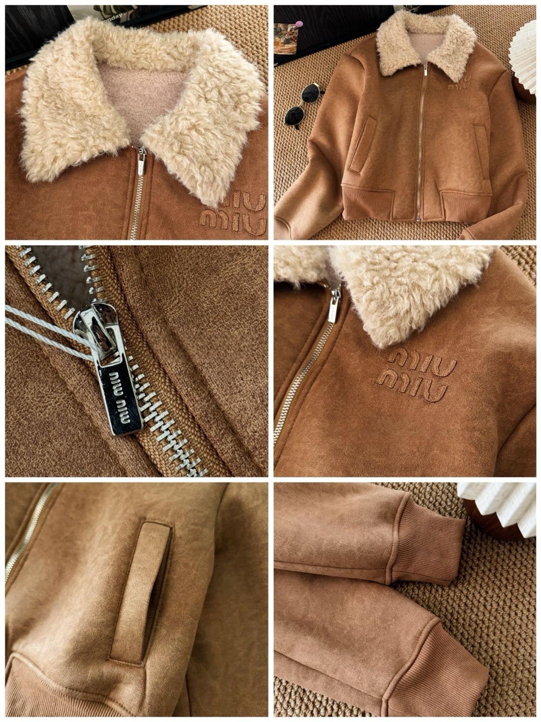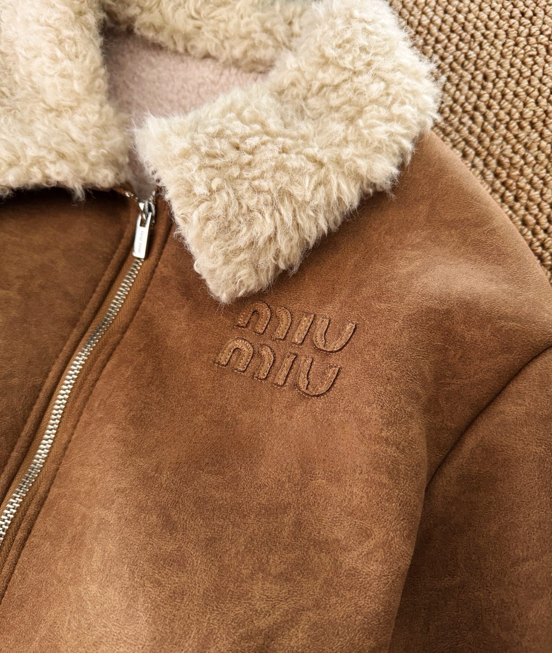 Miu Miu 徽標皮毛一體麂皮絨拉鍊外套