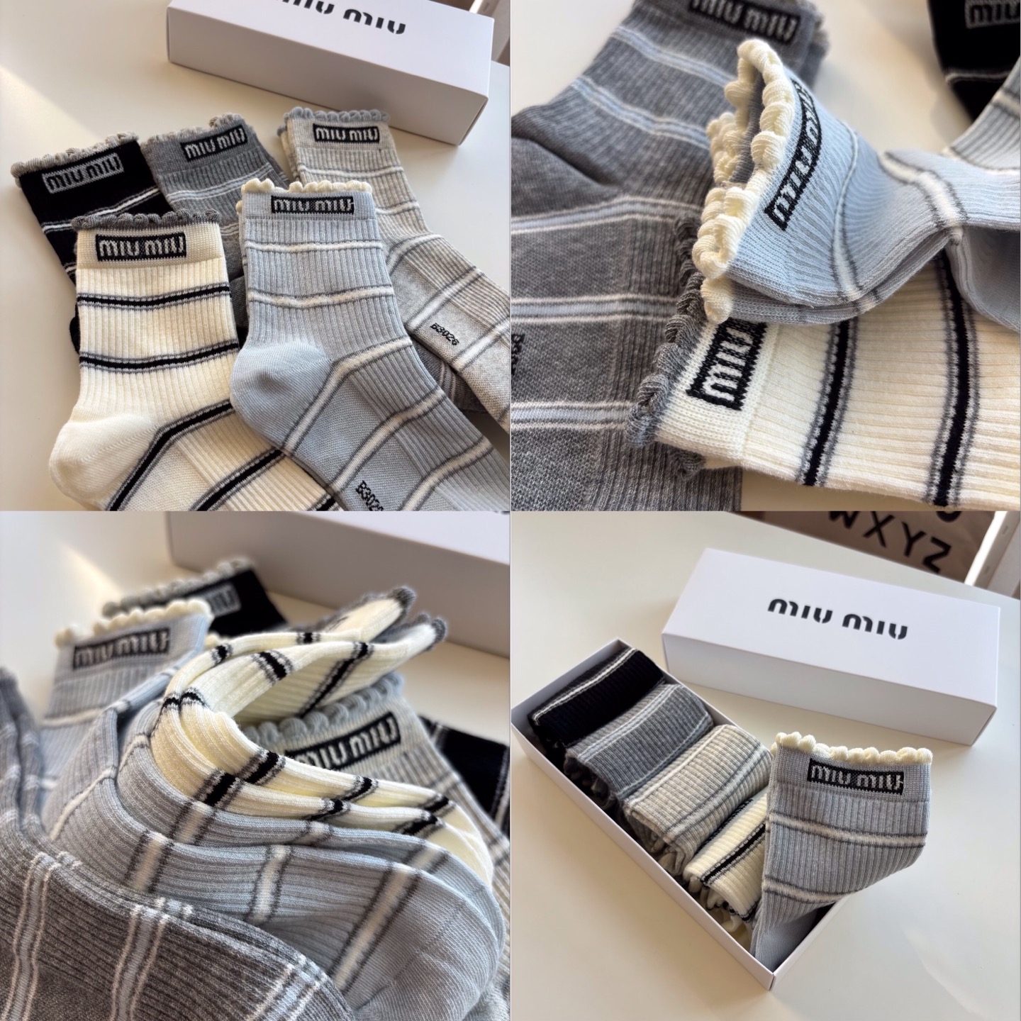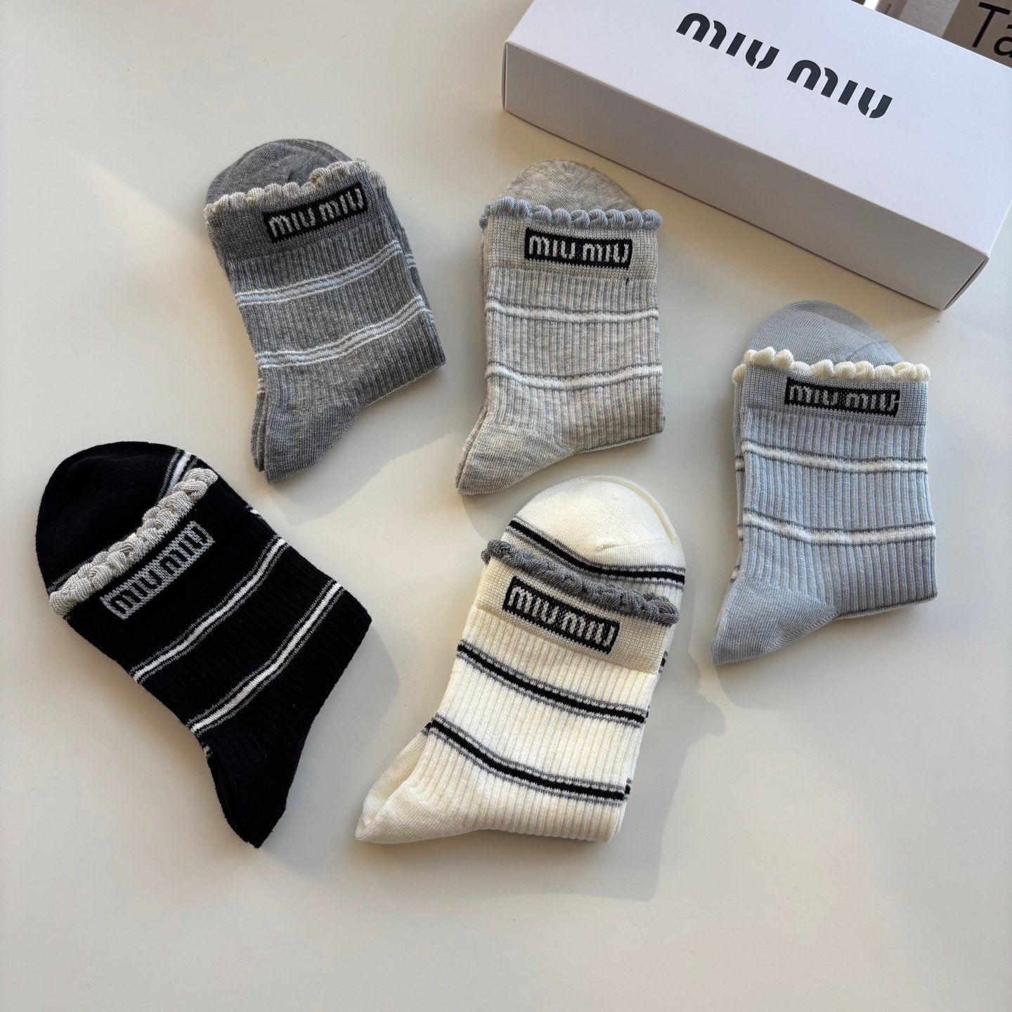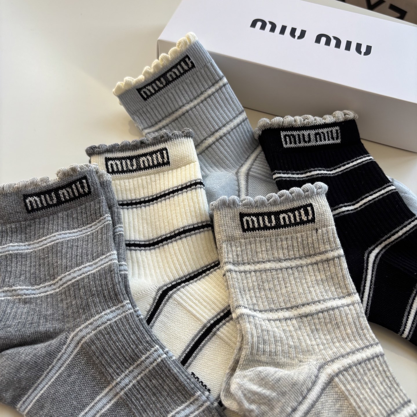 Miu Miu 木耳邊條紋中筒棉襪(一盒5對)