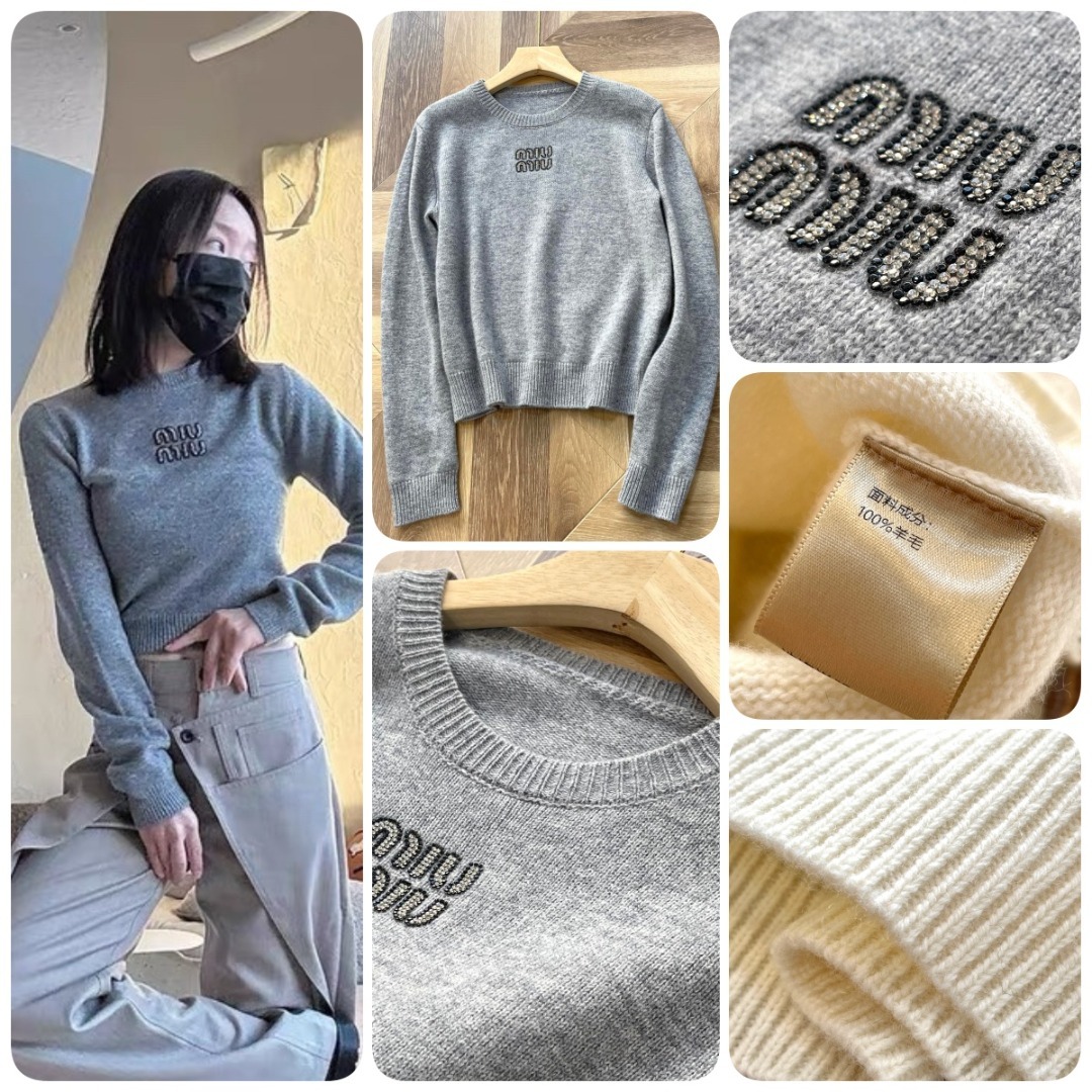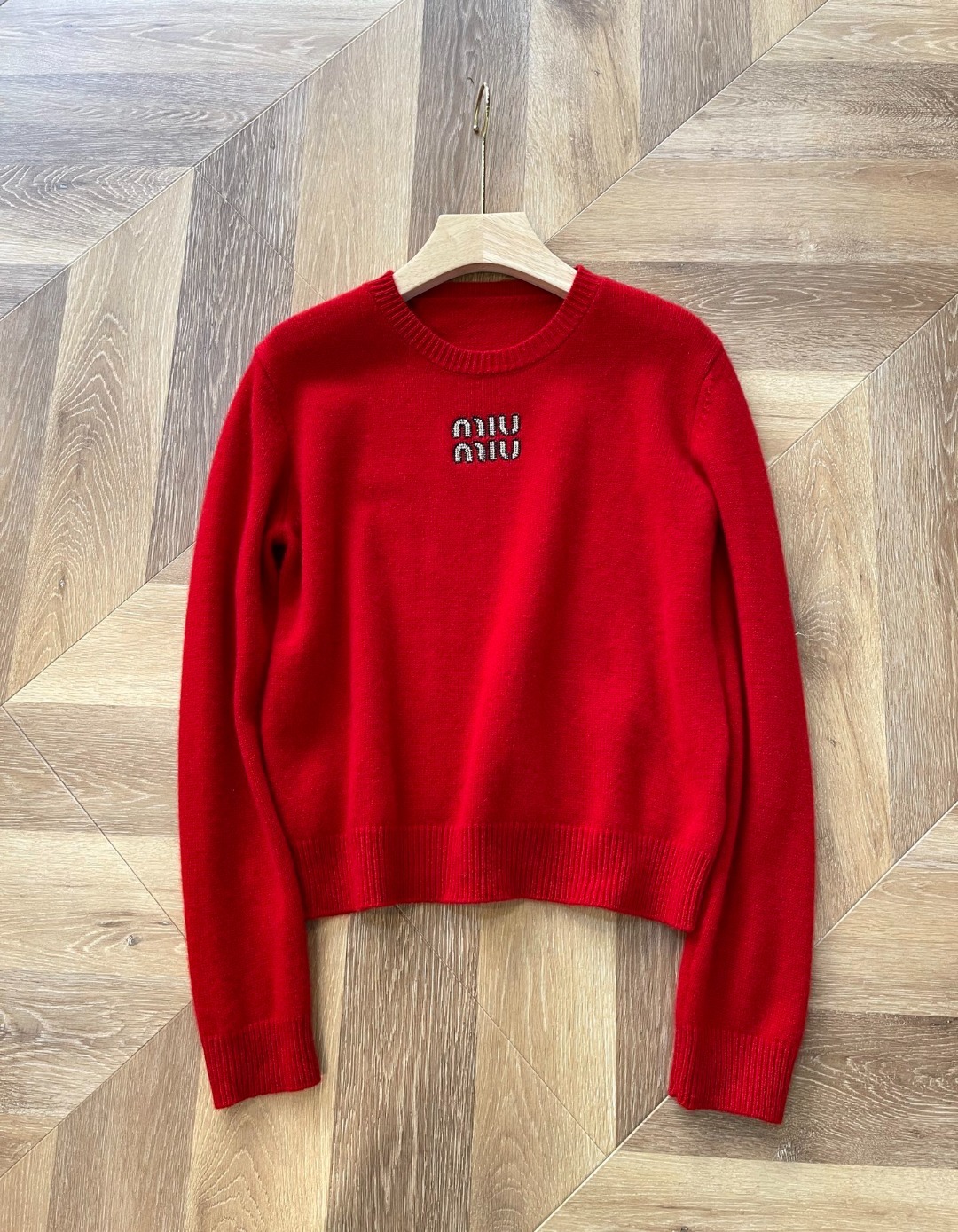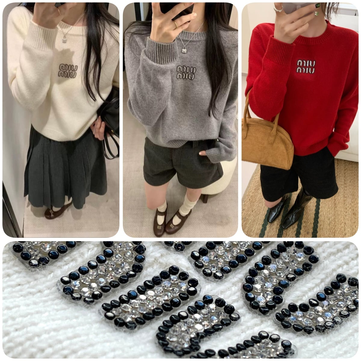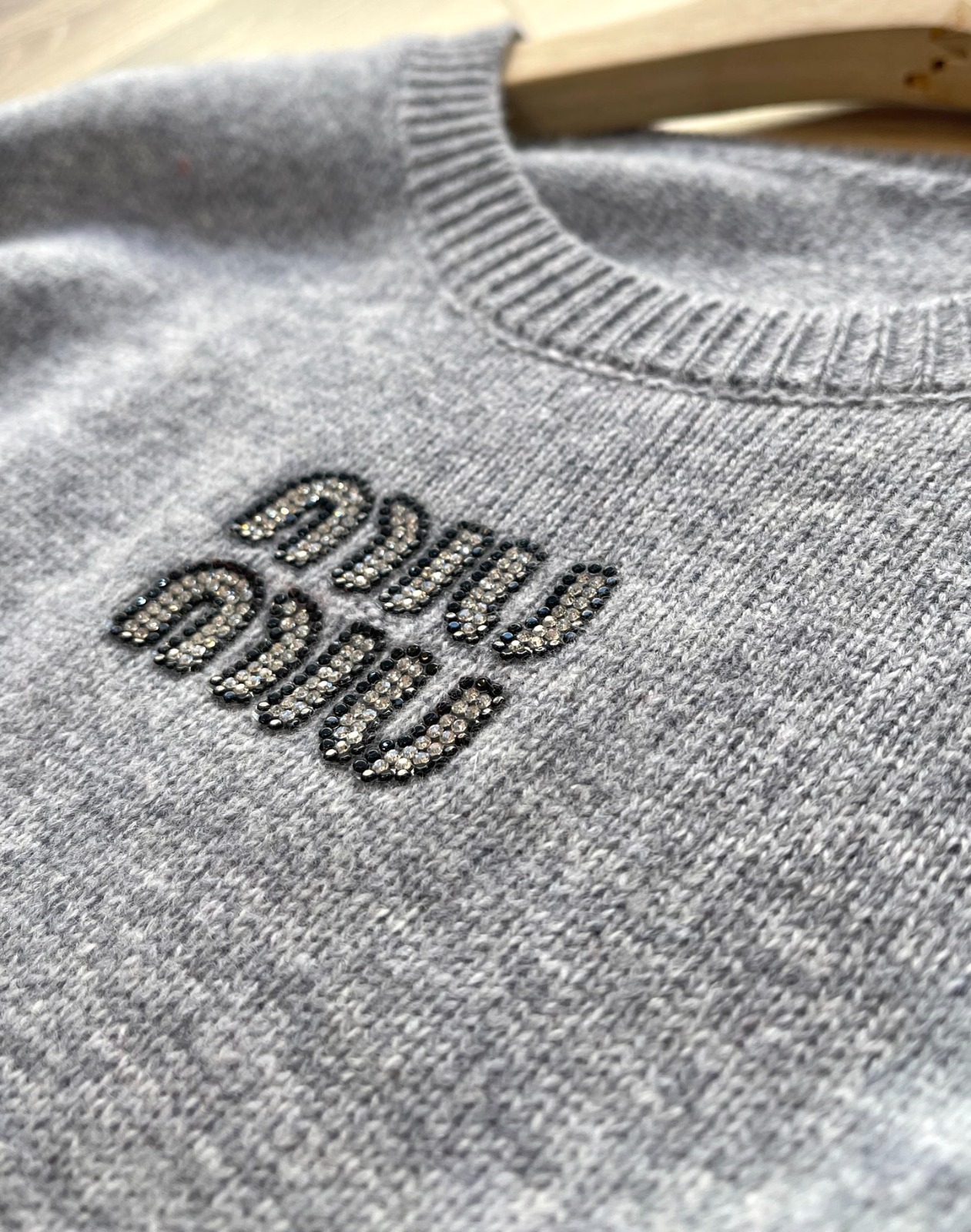 Miu Miu 水晶貼鑽徽標圓領羊毛冷衫