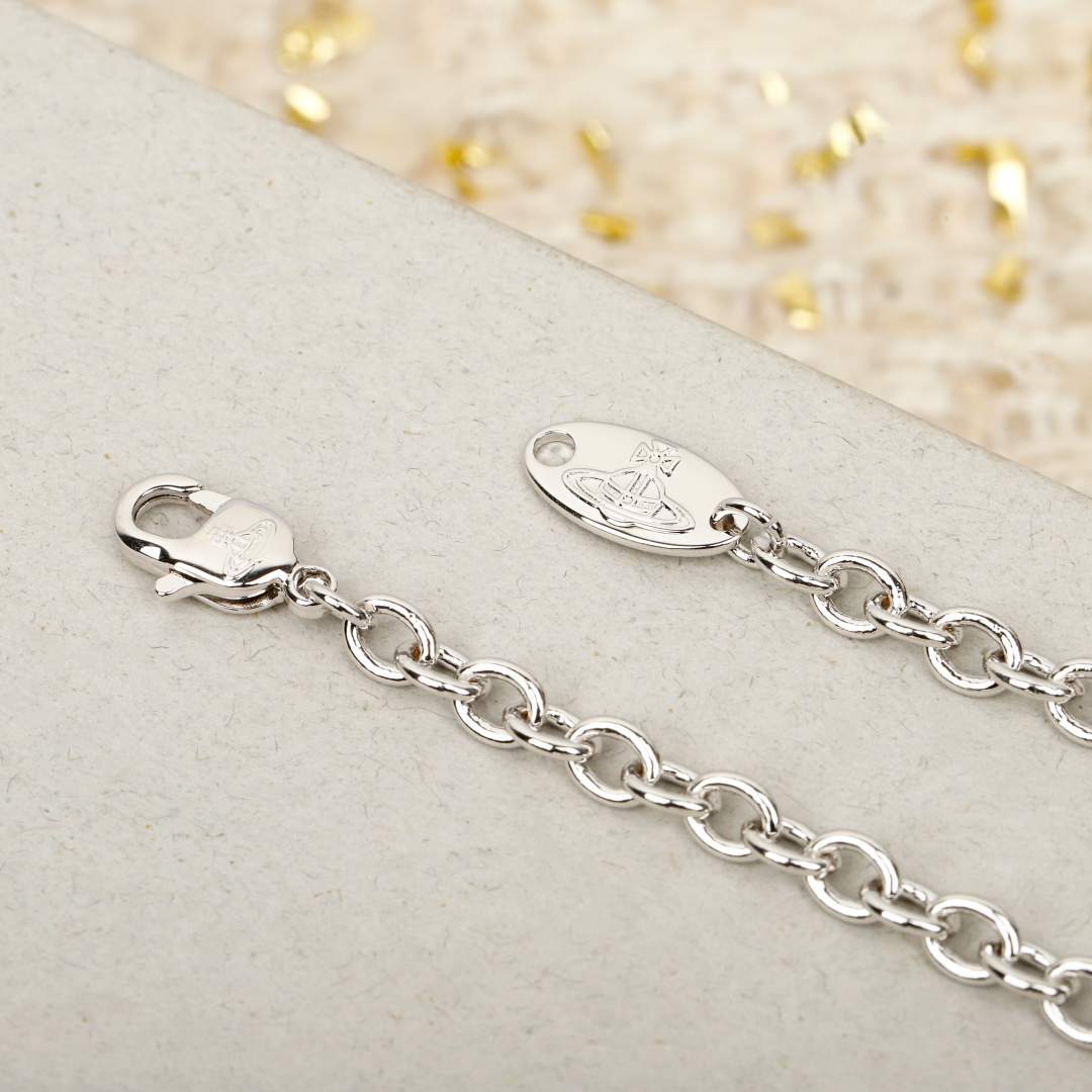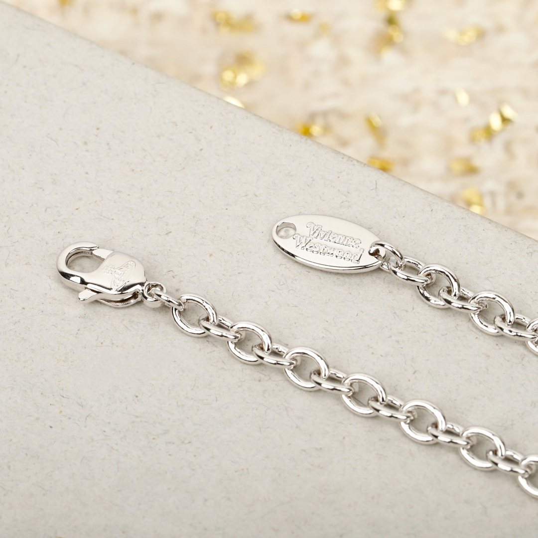 融合了品牌標誌性的喬治亞蝴蝶結和別針造型,展現了Vivienne Westwood的龐克美學。點綴白色水鑽,配上牢固的龍蝦扣環和球形品牌標籤。